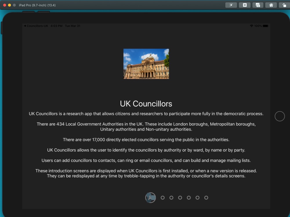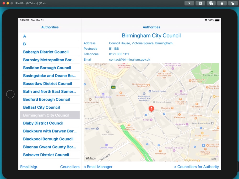 UK Councillors allows the user to identify the councillors by authority or by ward, by name or by party. Users can add councillors to contacts, can ring or email councillors, and can build and manage mailing lists.