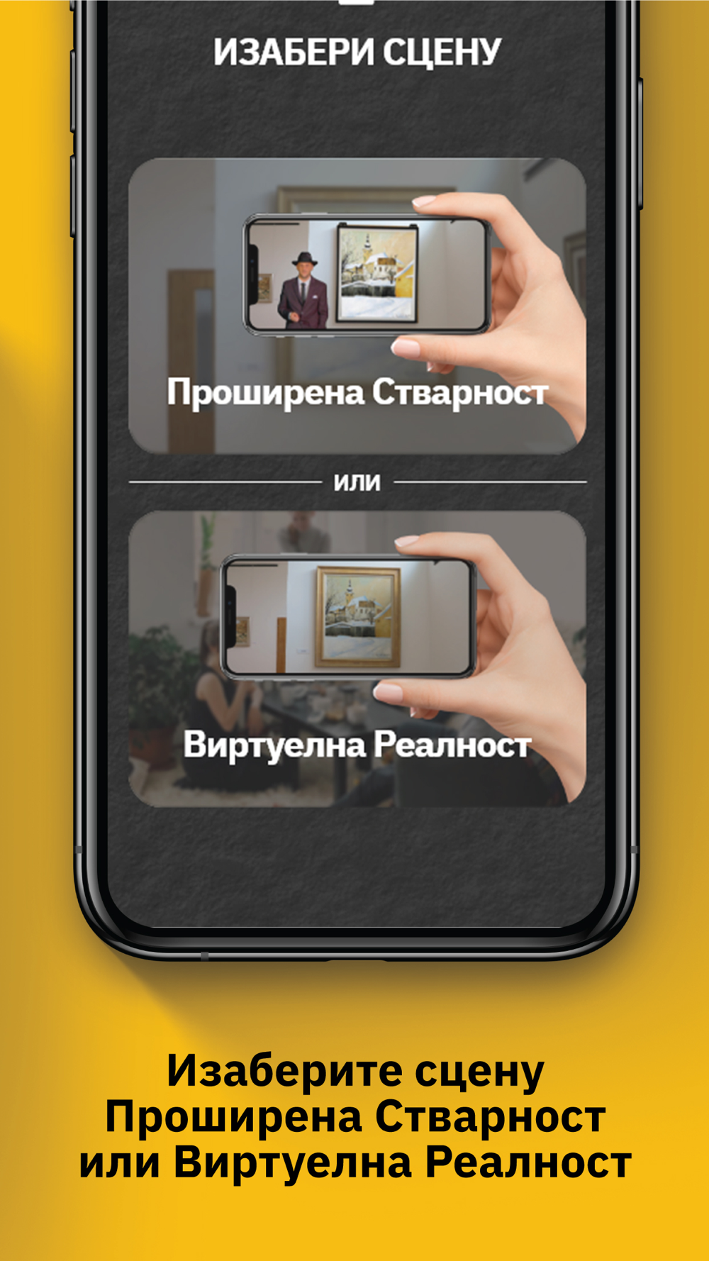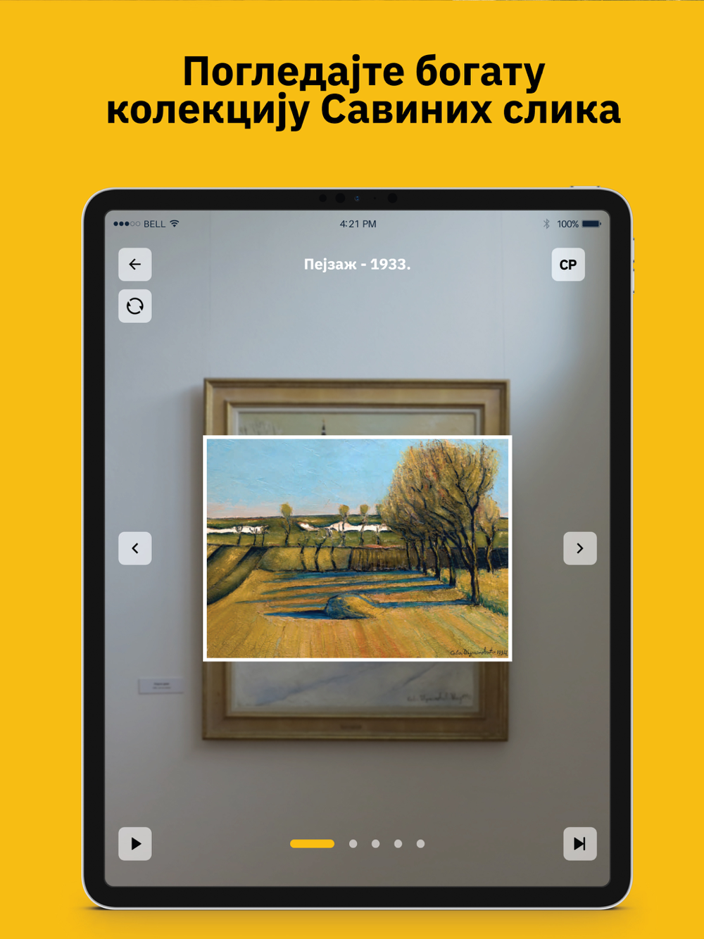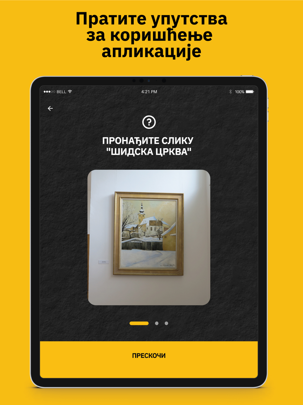 Augmented reality scenario starts by scanning the painting „Šidska crkva“ in „Sava Šumanović Gallery“. Trasnparent video of the actor positioned next to the painting appears. The narration is enriched with different audio-visual effects, such as 3D models, animations, particle effects, audio effects.