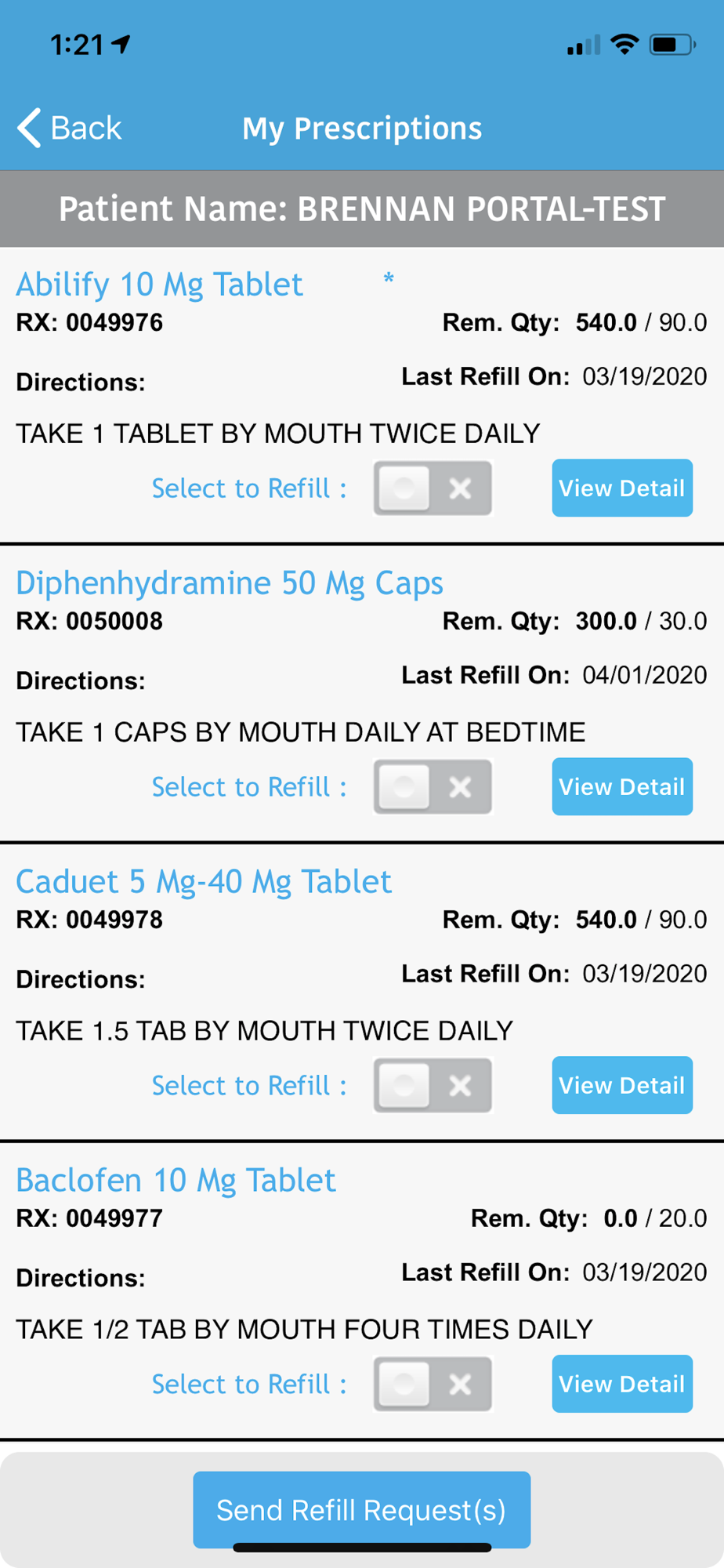 Track prescription histories, including status of requested refills