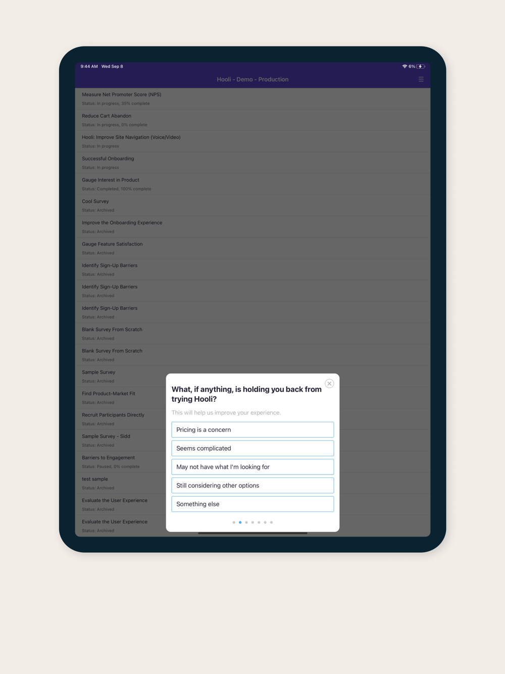 The app makes it possible for Sprig customers to preview surveys exactly as they will appear to users in a mobile setting. Log in, select your workspace, and choose any survey to preview the user experience on mobile.