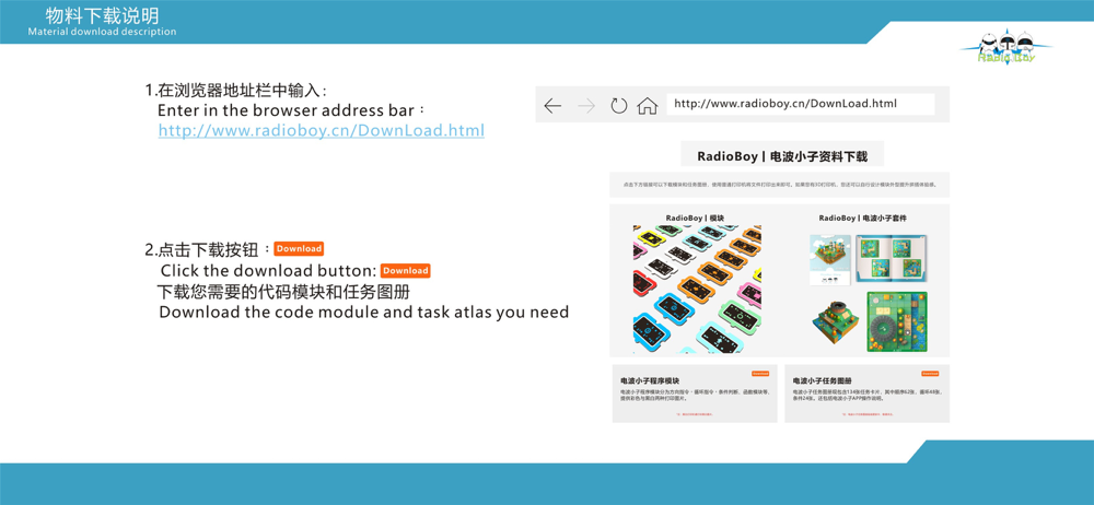 首先从电波小子思维启蒙游戏官网www.radioboy.cn下载所需物料,物料包括代码模块和任务图册。其次,下载好以后将文件通过普通打印机打印出来。最后,将代码模块切割成小块,这样就可以带着孩子踏上思维启蒙之旅了。
