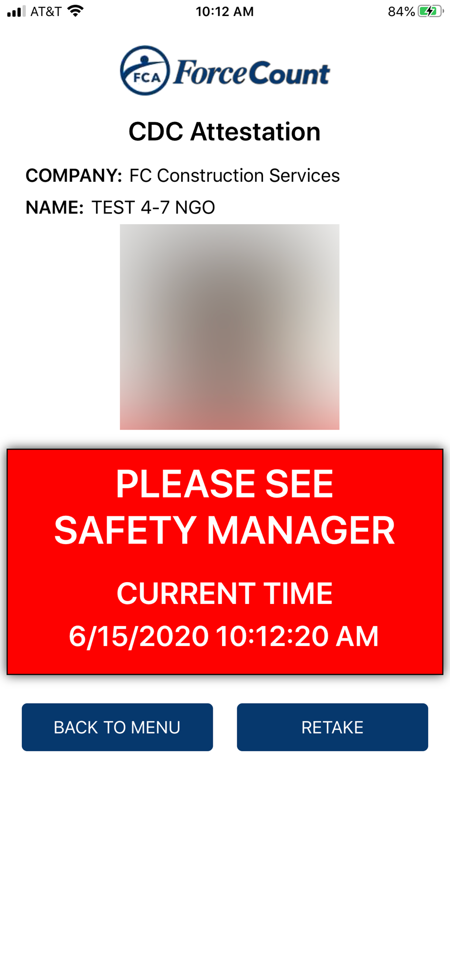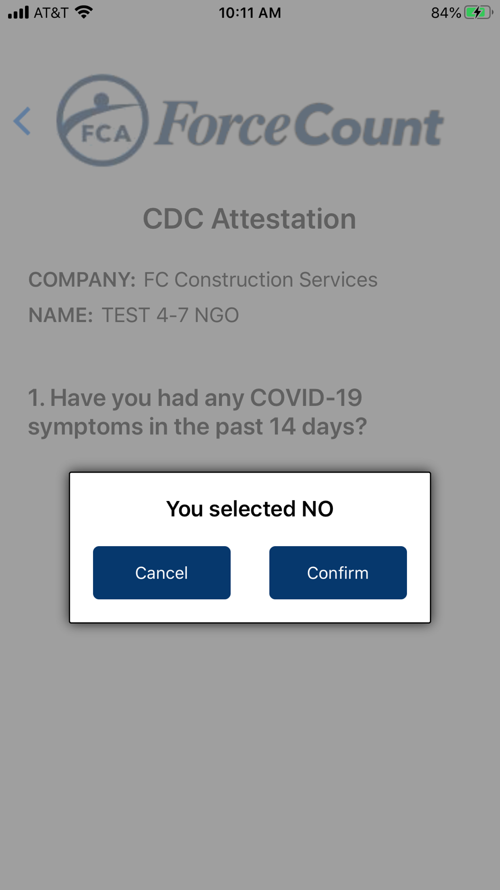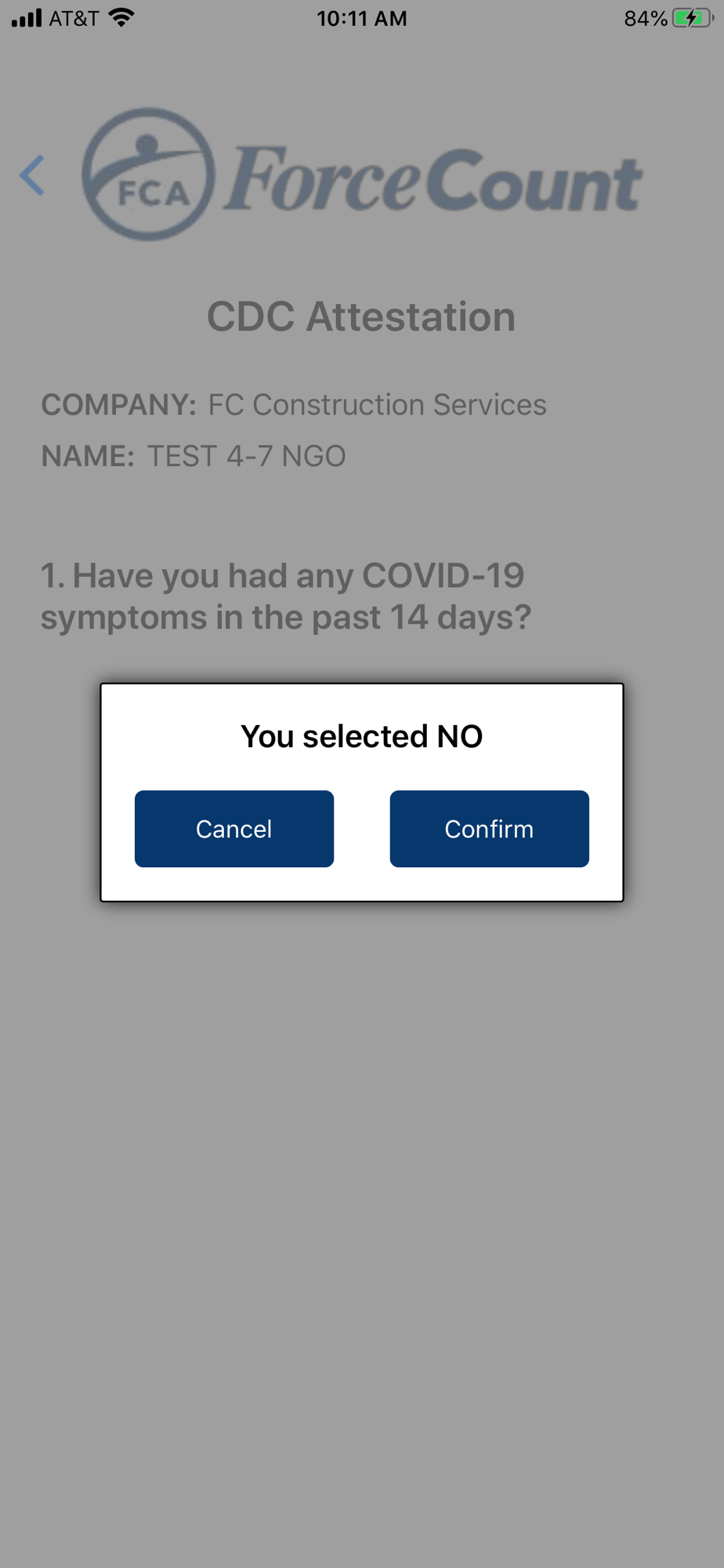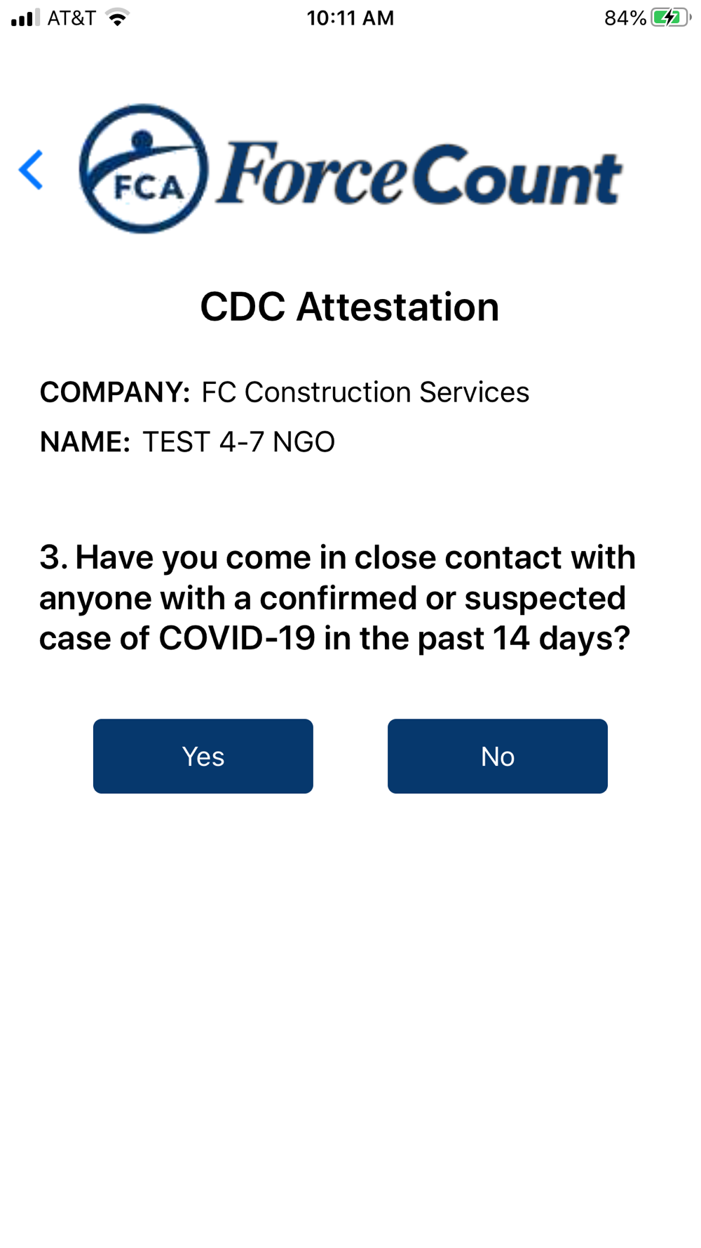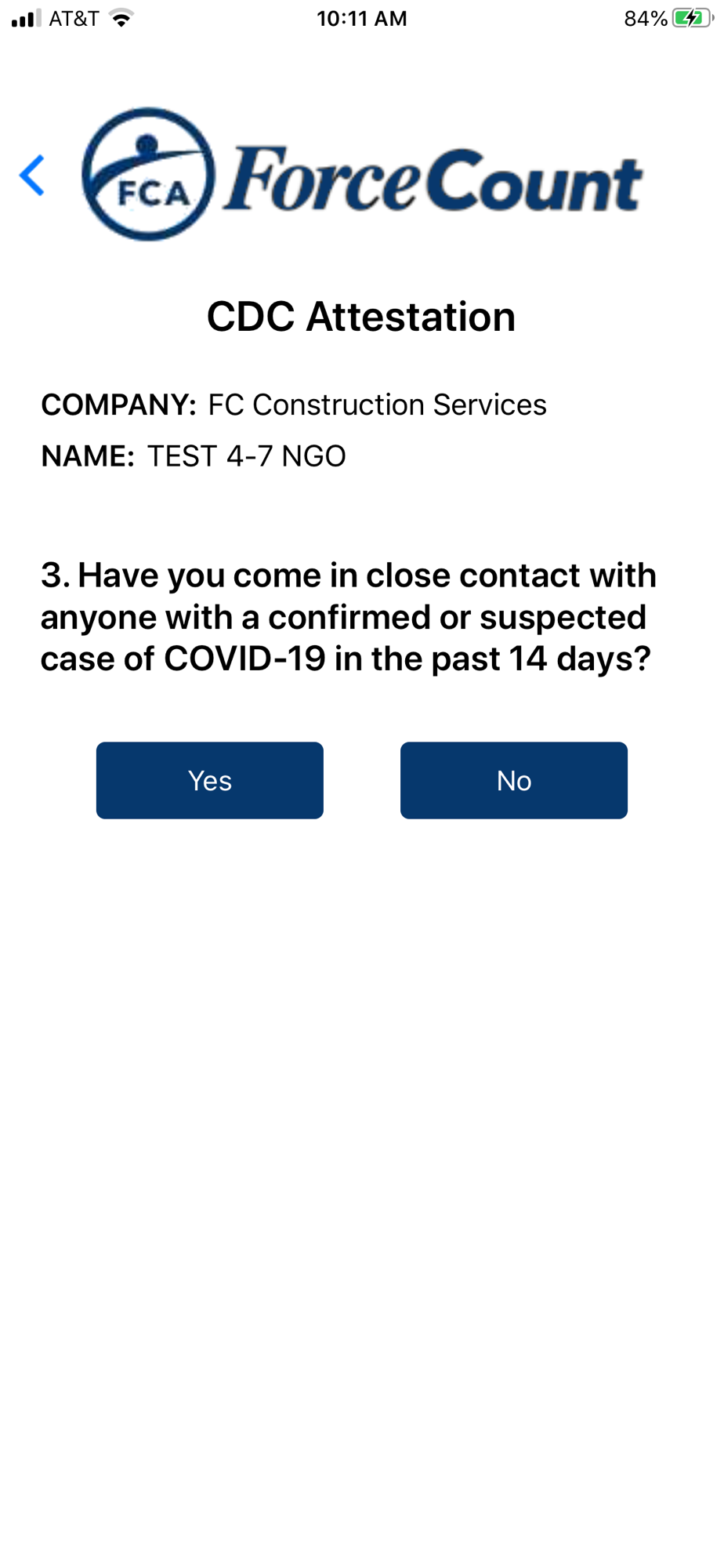 The ForceCount App allows workers of companies which have registered for FCA's services an easy method of self-reporting CDC attestation. Using their project-issued badge, workers can quickly and securely register to use the ForceCount app and begin providing CDC attestation electronically and as required by the project GC or owner.