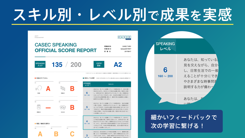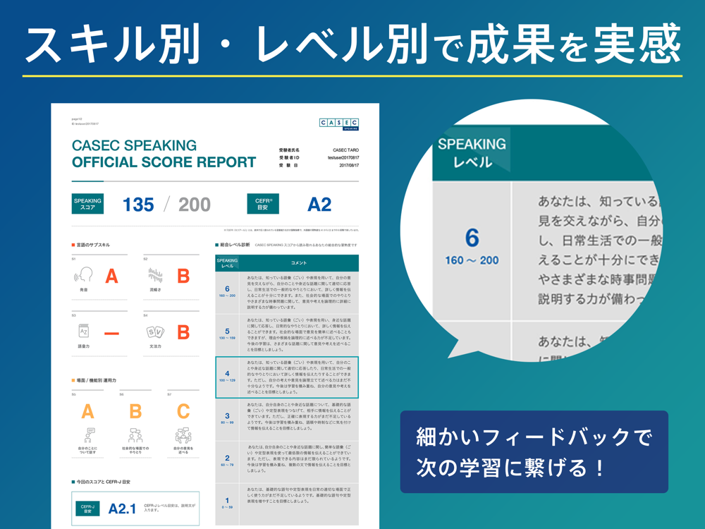 発音、流暢さ、語彙、文法、場面/機能別の運用力をそれぞれ3段階で評価するなど、スキル別のレベル判定やコメントが細かく記載され、次の学習につながるスコアレポート
