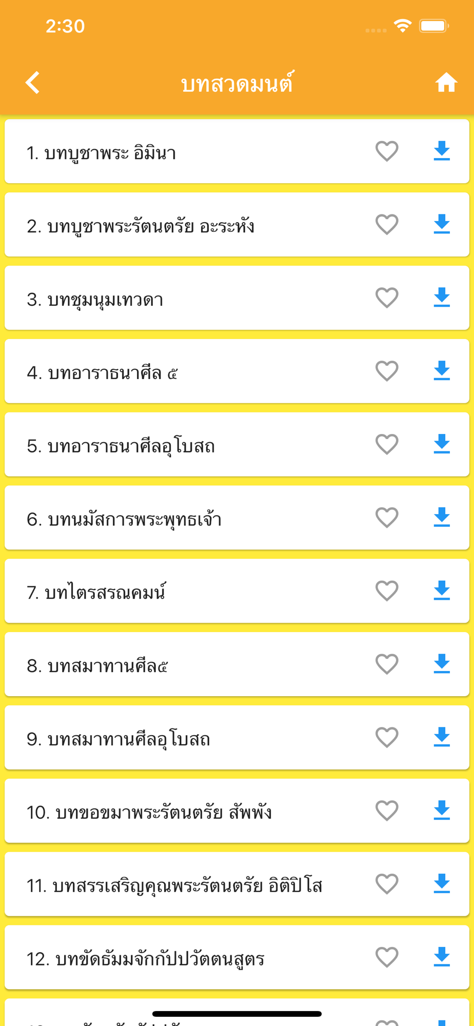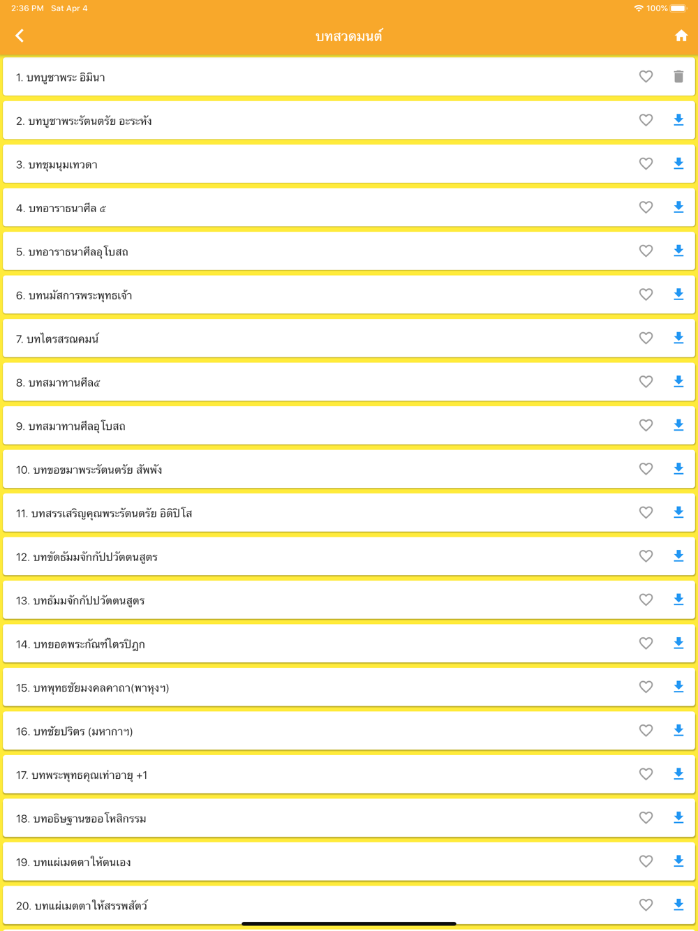 - สามารถตั้งค่าบทสวดมนต์ที่ชื่นชอบ โดยคลิ๊กรูปหัวใจ ท้ายชื่อบทสวด