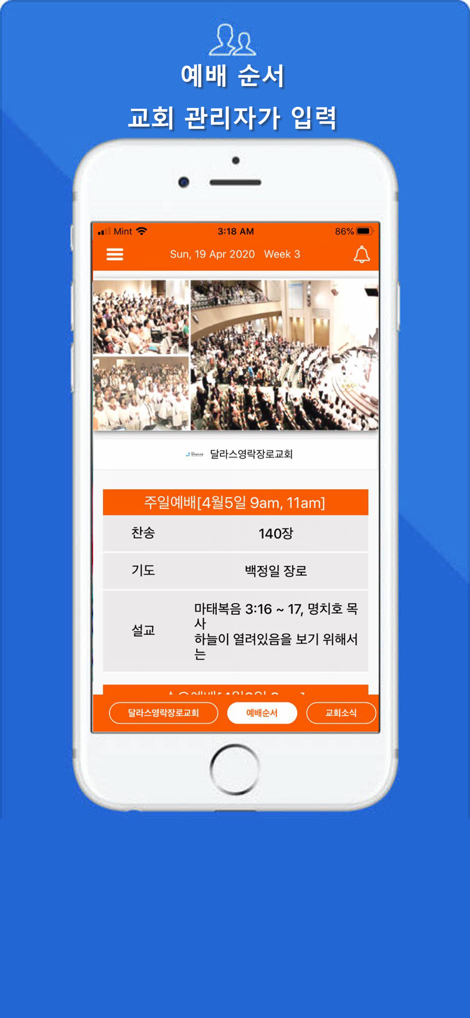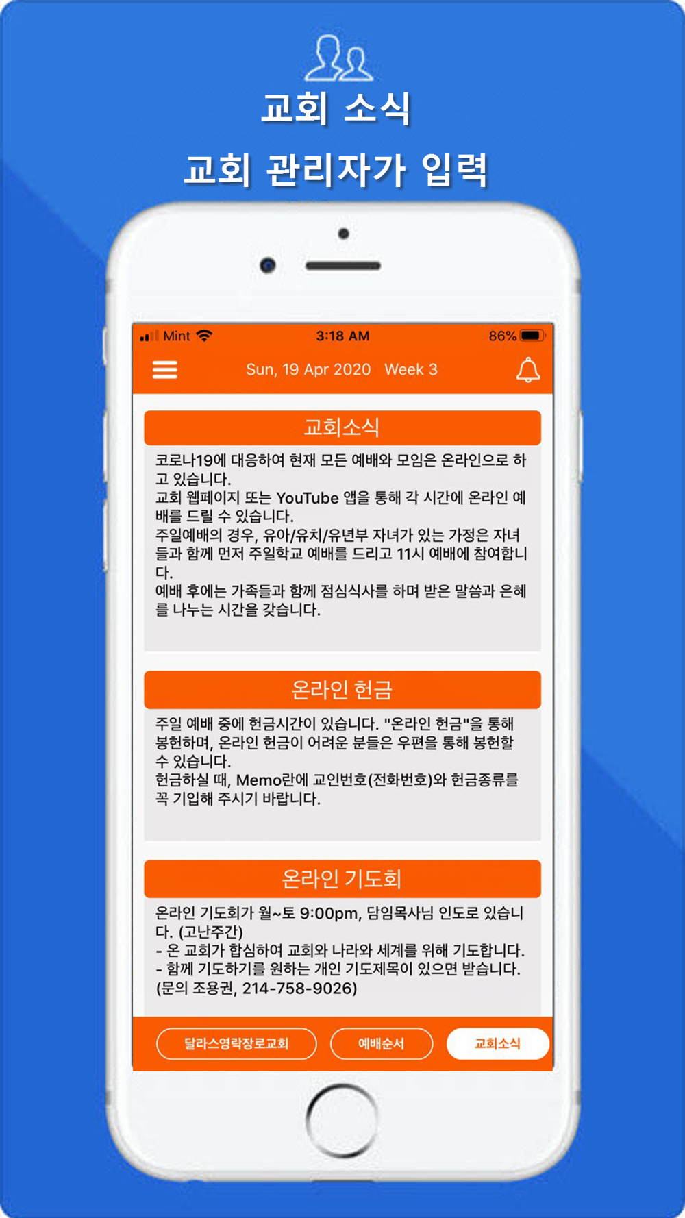 매 주 발행되는 교회 주보의 예배 시간, 순서를 성도들에게 제공하고, 교회 소식, 말씀 동영상을 제공하는 서비스입니다.