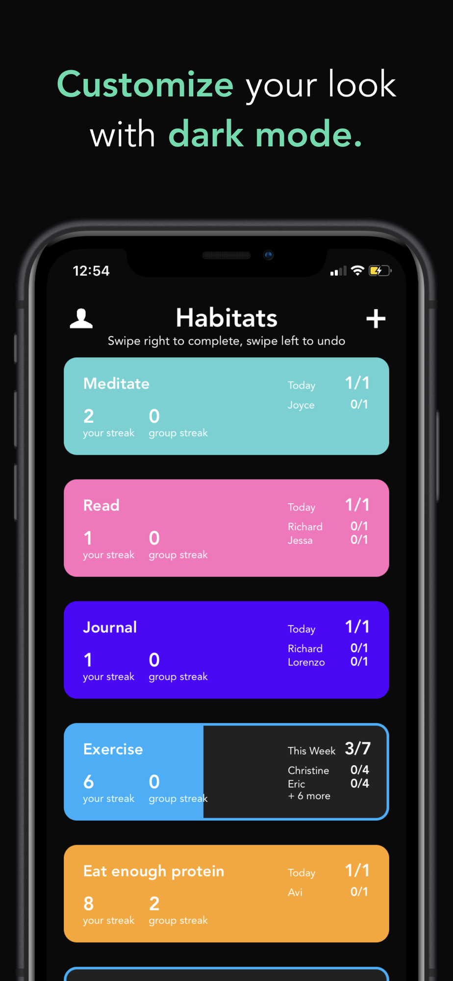 Create a habit/goal group (we call them habitats) for each of the habits you want to track and invite your friends! Or, join the habitats your friends create and invite you to.