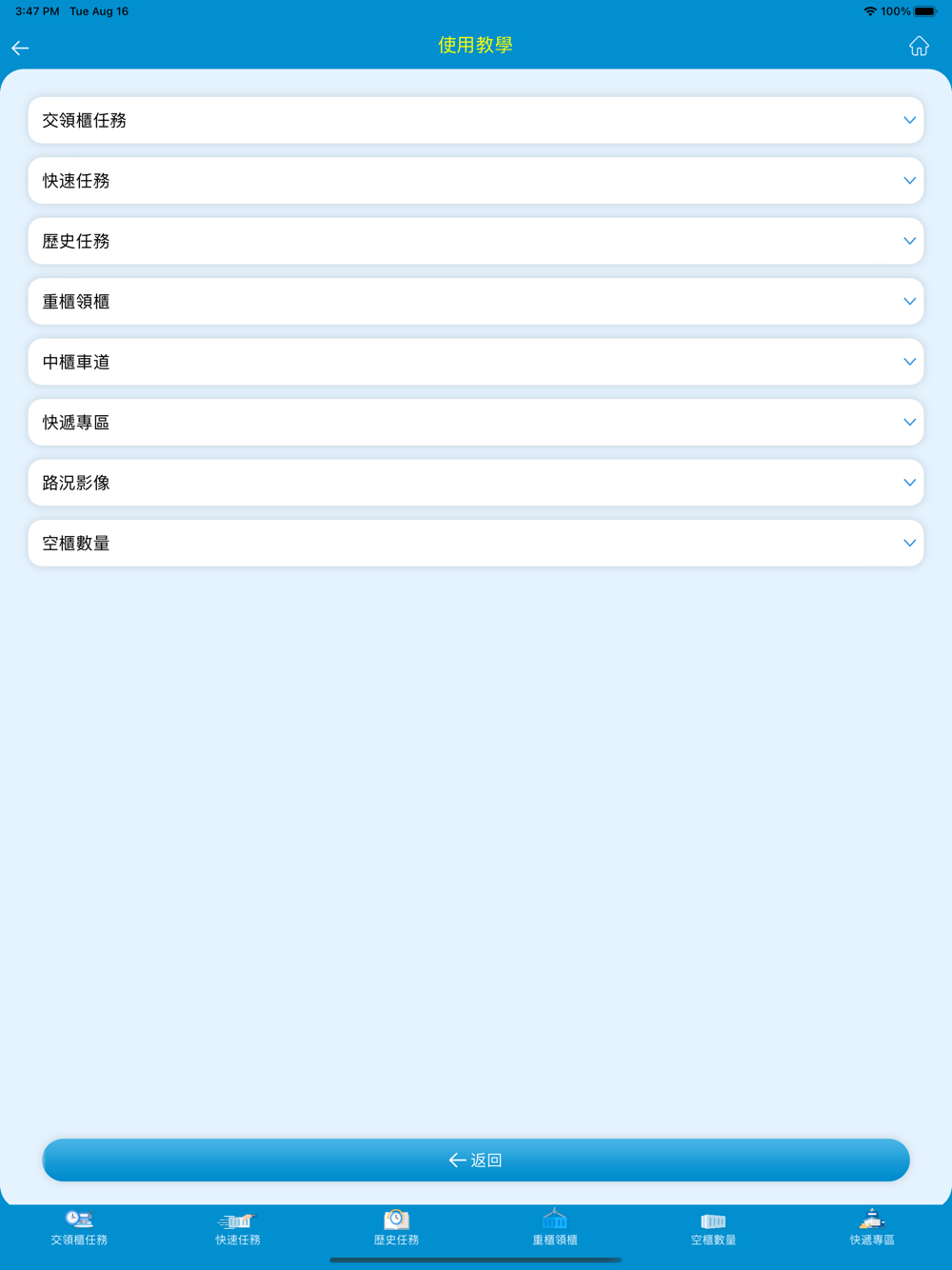 車隊系統任務派遣給司機後,司機可利用本APP接收任務;在任務執行的過程中,司機可以藉由本APP彙報任務階段的狀況:以此紀錄司機大哥跑了多任務。