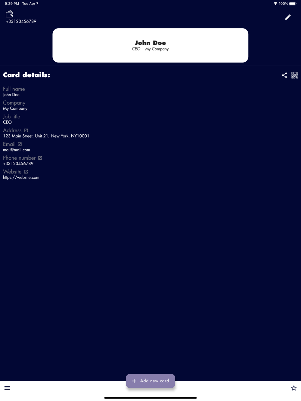 When you open a business card, you can save it easily and find it in the application.