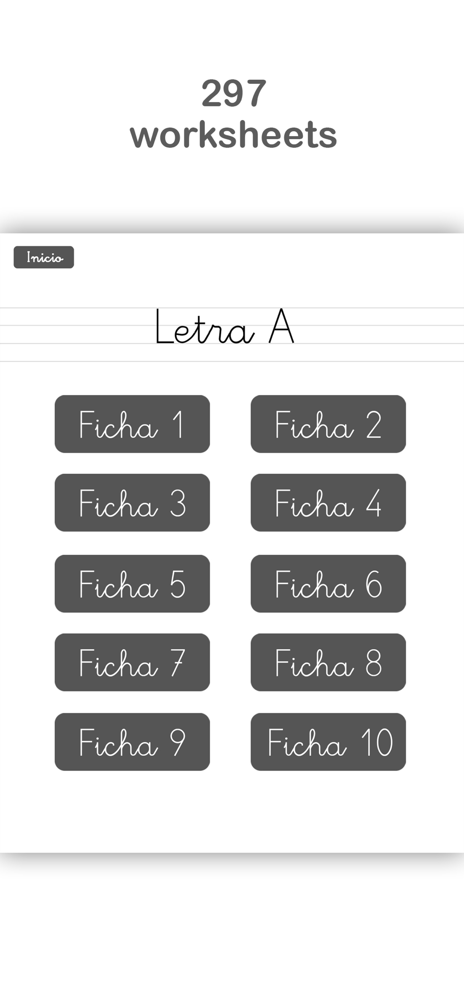 - A total of 297 worksheets and 1188 dotted font guidelines, including all letters, syllables (including closed syllables) and a lot of words, all available from day one