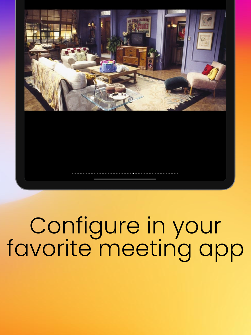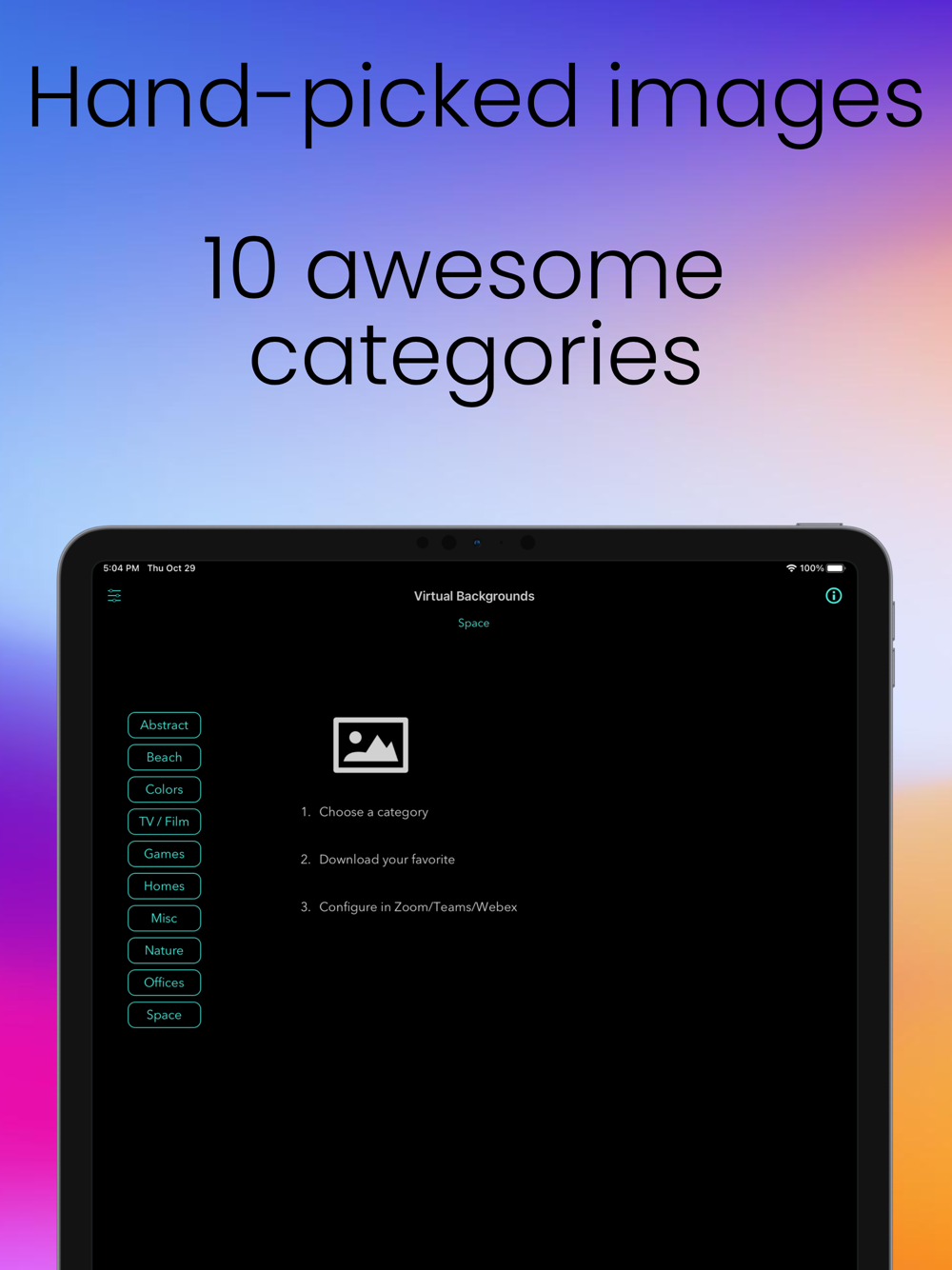 Virtual Backgrounds features a minimalistic design with a curated library of awesome backdrops to use with your virtual conferencing platform. Download your favorites, then launch your video conferencing app (Zoom, Microsoft Teams, etc) and configure the custom background.