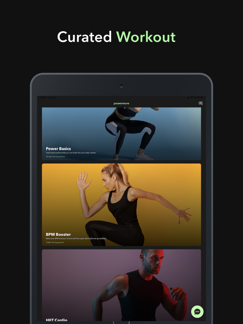 CURATED WORKOUTS: Powermove includes a variety of short but effective home workouts to ensure that you can accomplish your fitness goals. This includes no-equipment HIIT, short BPM boosters, total body bootcamps, butt workouts, and upper body workouts. We also offer resistance band and miniband workouts that are ideal for doing at home.