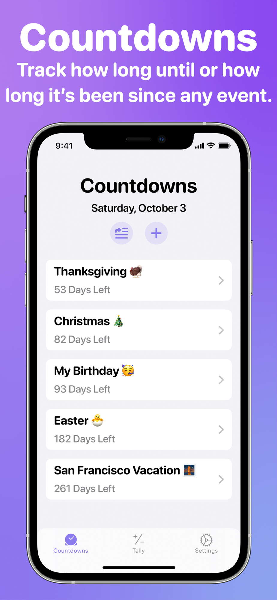 With Countdowns, you can count how long it is until a certain event, such as your birthday. You can also count how many days it's been since an event, such as starting a diet. You can also set a custom background for each Countdown for a more beautiful look. You will also get a notification when the Countdown is finished!