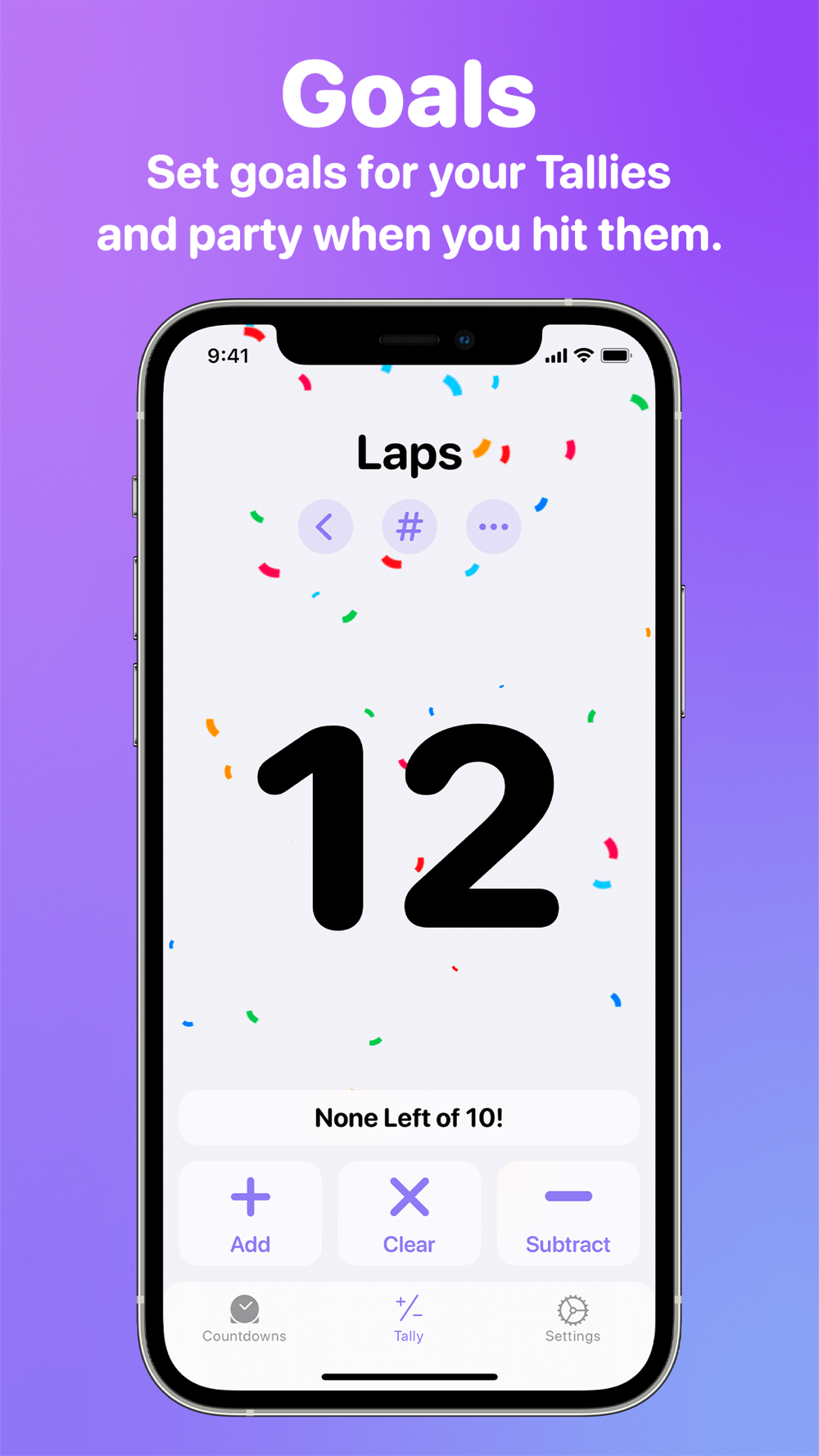 With Tallies, you can create unlimited tallies to count up to or down to a goal. When you hit this goal, you will see confetti on the screen! You can easily add or subtract any of your Tallies from the main tab, as well as see their current total.