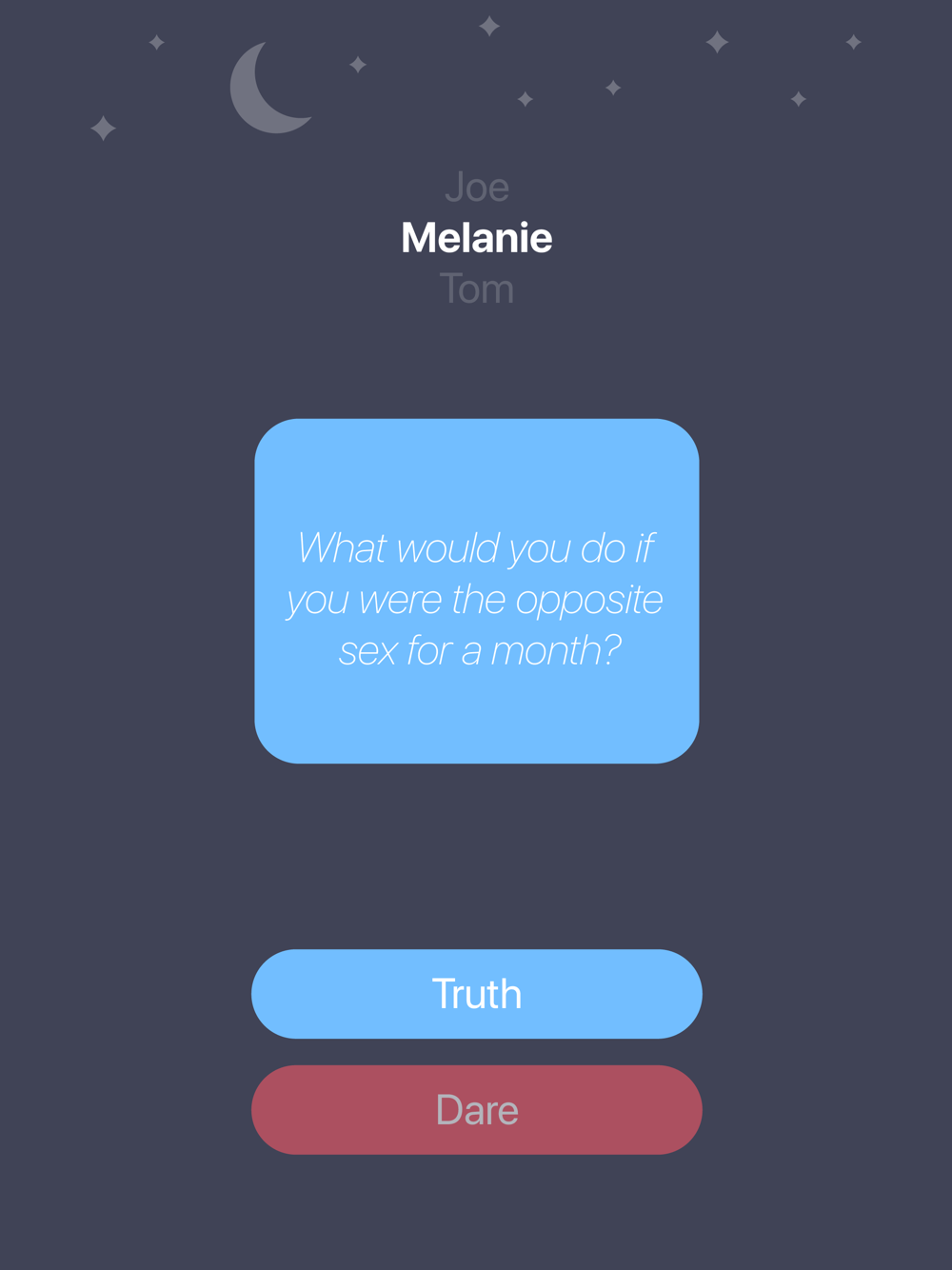 With hundreds of the best hand picked truths or dares - ranging from clean, dirty, to super dirty, you can play for hours and hours with your friends or significant other and never get bored! Perfect truth or dare app to play with friends, at a party, for couples and families!