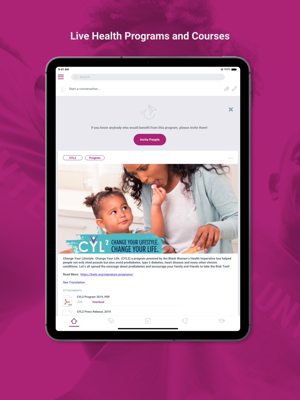 With the BWHI App, the Black Women’s Health Imperative (BWHI) are working to make optimal health and well-being a reality for all black women and and girls. CYL² is a lifestyle change program that utilizes the Centers for Disease Control and Prevention (CDC) approved curriculum to help prevent type 2 diabetes and other preventable chronic conditions. The program includes a lifestyle coach who can provide the education and support needed to replace unhealthy habits with healthy ones that lead to a path of long-term success. Through the app’s features, participants learn problem-solving skills and coping strategies for overcoming barriers to lifestyle changes, such as shopping for and preparing affordable and healthier meals, stress and emotional eating, food triggers, eating away from home and access to healthier food choices overall. A community of others on their personal wellness journeys will provide the much-needed support with discussions about solutions to overcome common challenges to wellness.
