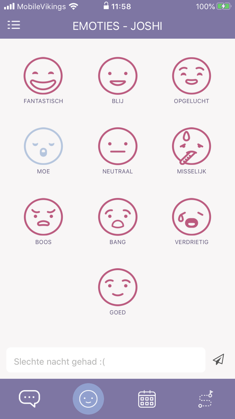 *WELZIJN*: Ben je niet zo'n prater? Laat via een emoticon weten hoe je dag is geweest en als je er graag wat meer over wil vertellen, voeg je een berichtje toe.