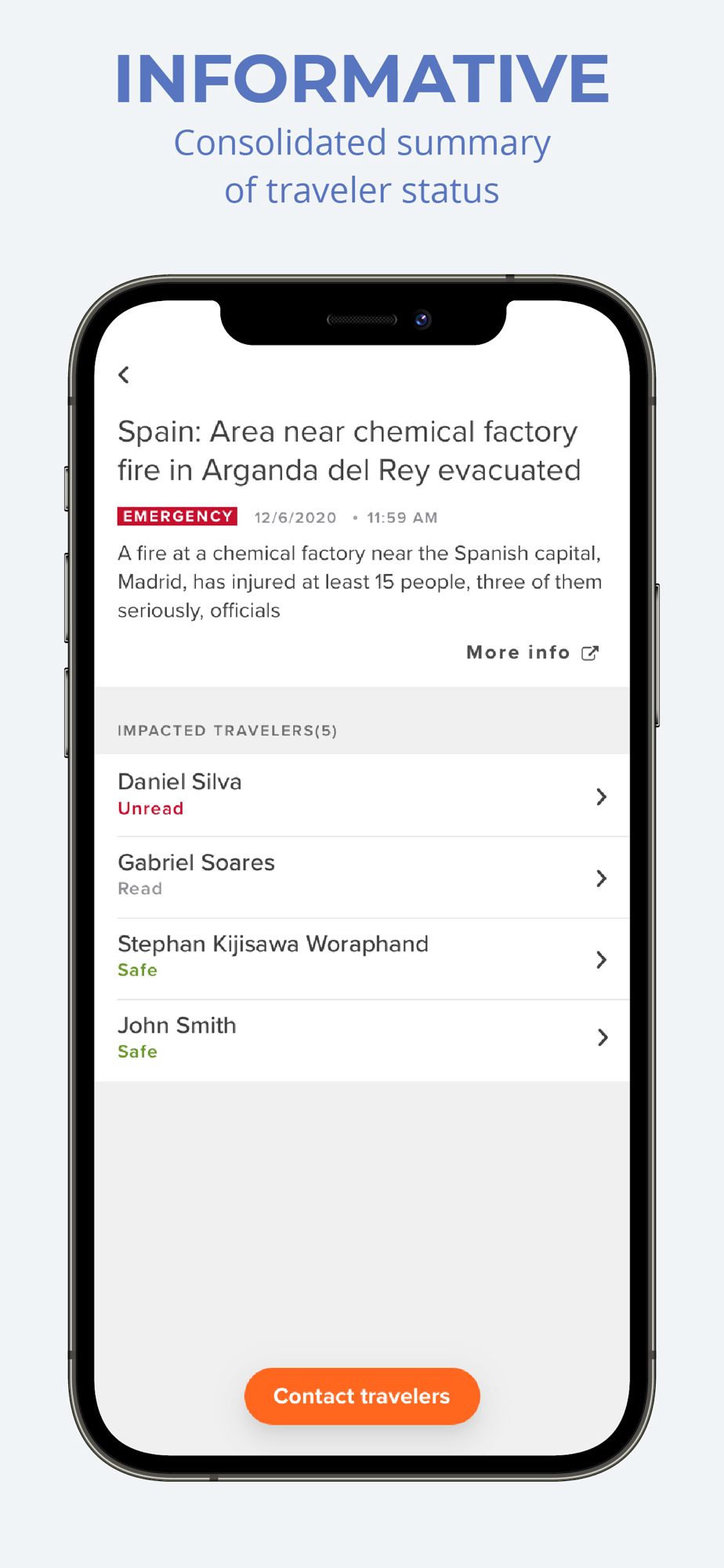 Managing a traveler security program is a 24/7 job. The BCD Alert app allows you to not only monitor your travelers in relation to risk, but also track their status, and take action.