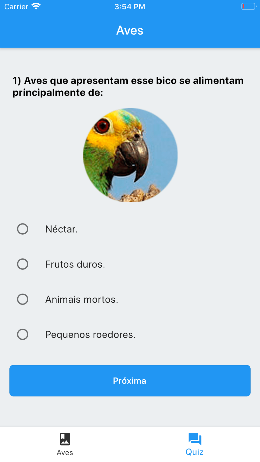Neste aplicativo também podemos encontrar um Quiz com perguntas relacionada ao estudo das aves e a conceitos ecológicos, com o intuito de enriquecer as aulas de ecologia e tornar o aprendizado mais dinâmico com a inserção de metodologias ativas, estimulando o protagonismo do educando.