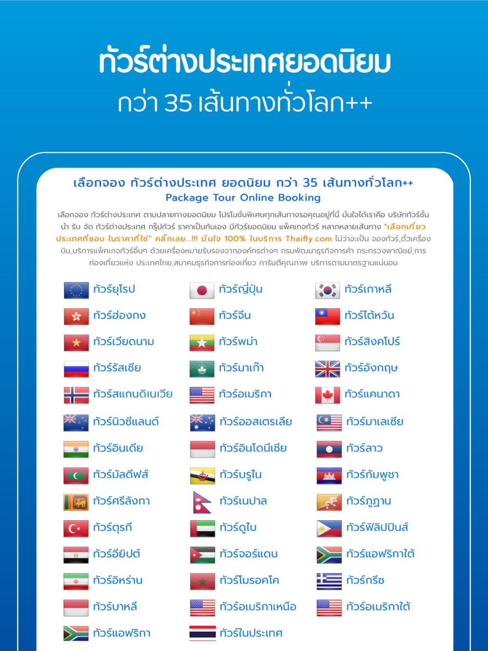 แอพพลิเคชั่น Thaifly แอพเดียวครบ จบทุกบริการการท่องเที่ยว ให้เรื่องเที่ยวเป็นเรื่องง่าย ในไม่กี่คลิก ด้วยเมนูการใช้งานที่ง่าย สะดวก และลื่นไหล มาพร้อมศูนย์รวมโปรแกรมทัวร์ต่างประเทศ จากทั่วโลก ที่รวมทัวร์ต่างประเทศมากกว่า 5,000 โปรแกรม ราคาดีที่สุด อัพเดตเร็วทุกนาที ให้คุณเช็คที่นั่ง จองทัวร์ จองตั๋วเครื่องบิน ได้ผ่านแอพพลิเคชั่นของเรา แบบลื่นไหลไม่มีสะดุด