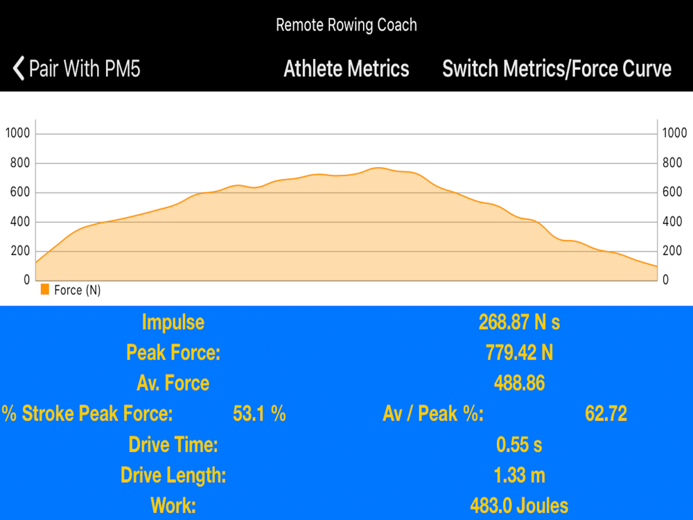 The stroke analysis screen allows for stroke by stroke comparison of force curves for those users that want to look at any of their individual force curves.
