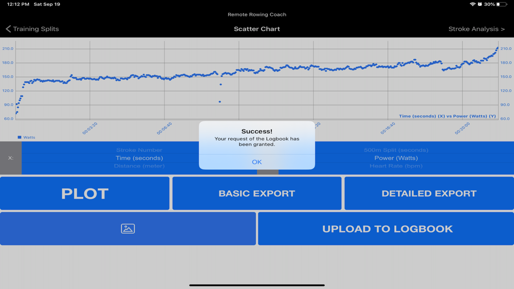 If your app is authenticated with the Concept2 Logbook, view your training data from within the app. A scatter graph is used to show pace / 500m, stroke rate, power, and heart rate (heart rate was recorded using the PM5).