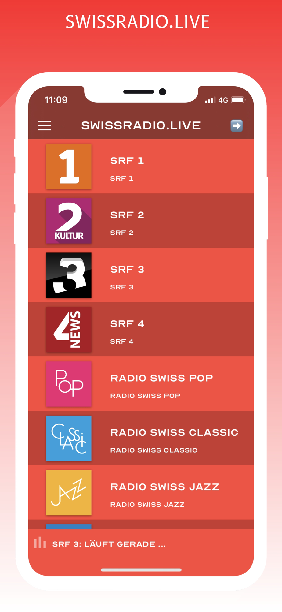 With Swissradio.live you can listen to all the major swiss public radio stations like SRF 1, 2, 3, 4, Radio Swiss Pop, Radio Swiss Jazz, Radio Swiss Classic, RTS, Rete 1 and more ! . No ads, neither on air or in the app. Enjoy!