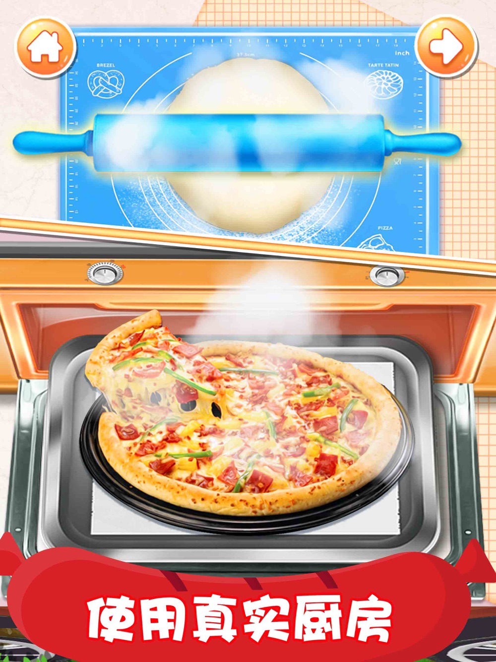-可体验许许多多真实的烹饪工具:碗、铲子、勺子、烤箱、擀面杖、矬子、比萨切割器、比萨模具、冰淇淋勺子、比萨卷制作套装、喷火器等等