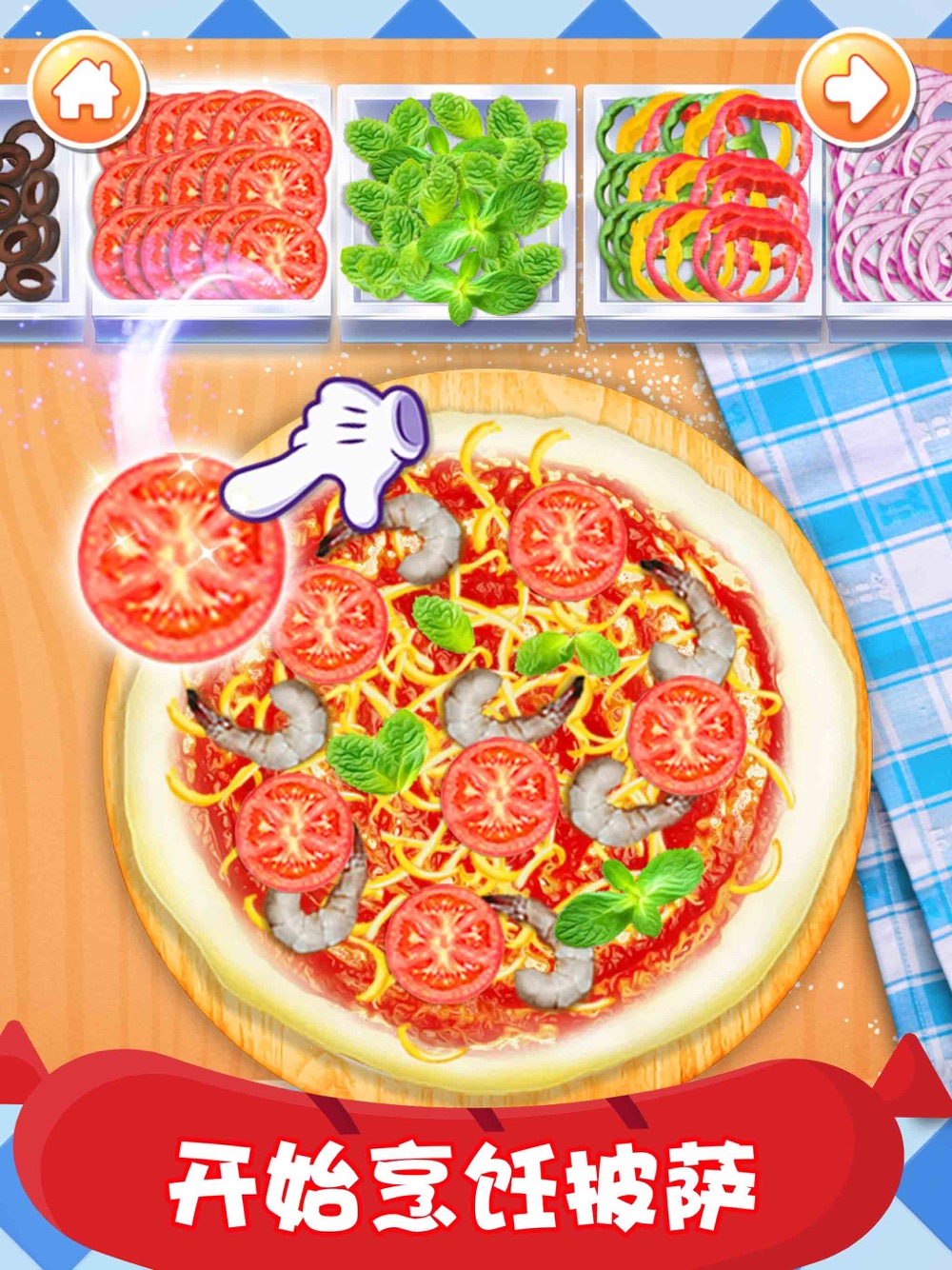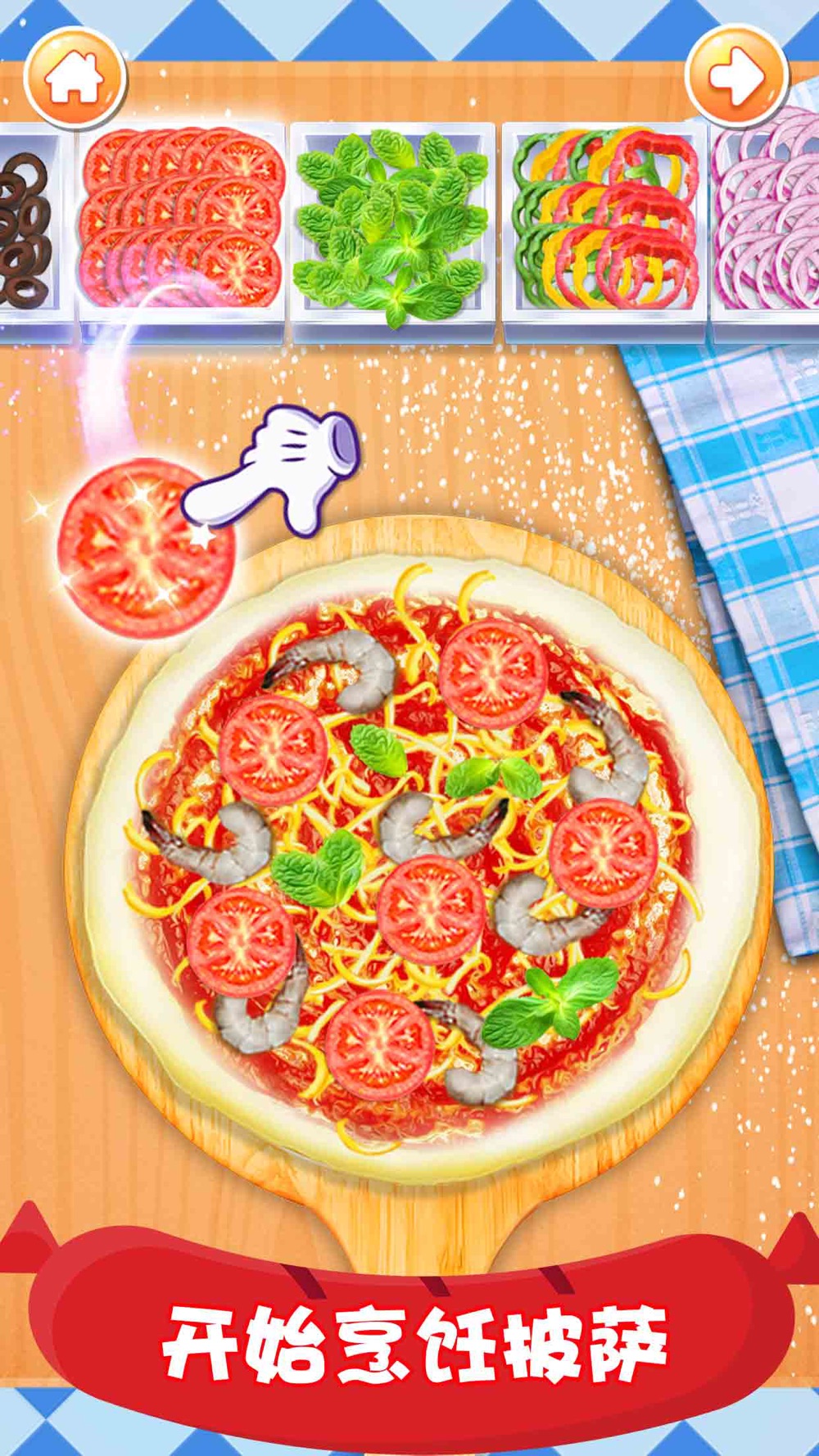 -按照游戏中的手势提示、箭头提示、图标提示等等去一步一步烹饪比萨