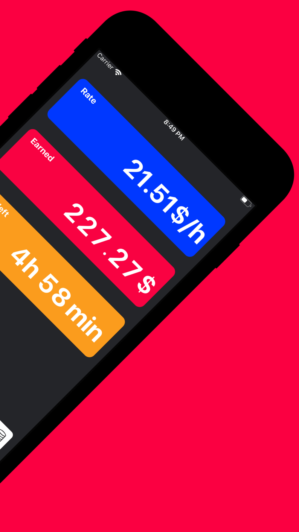 Boring job? Want to cheer yourself up? This app will show you in real time how much you have already earned in the current day, week, month, year. It's not your budget planner. No expenses. Just your Income. Keep track of your money and dream of how you'll spend it.