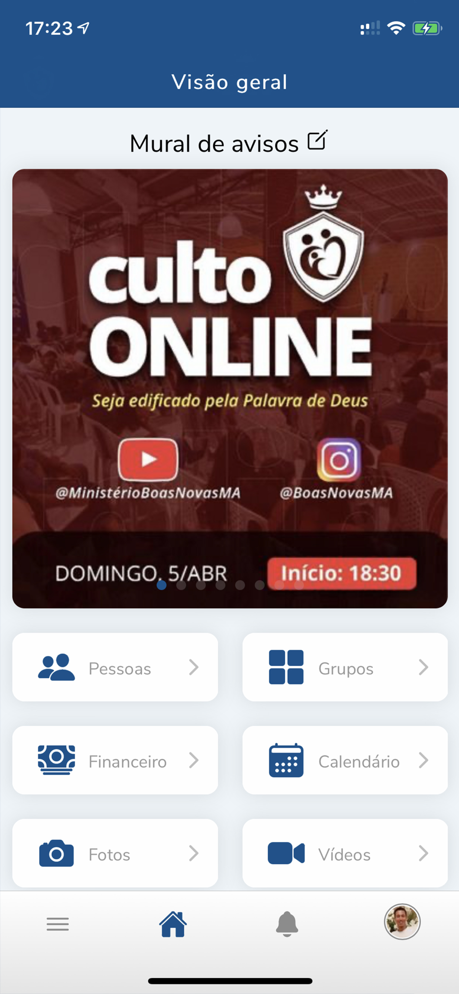 - Mural de avisos destacado na tela inicial;