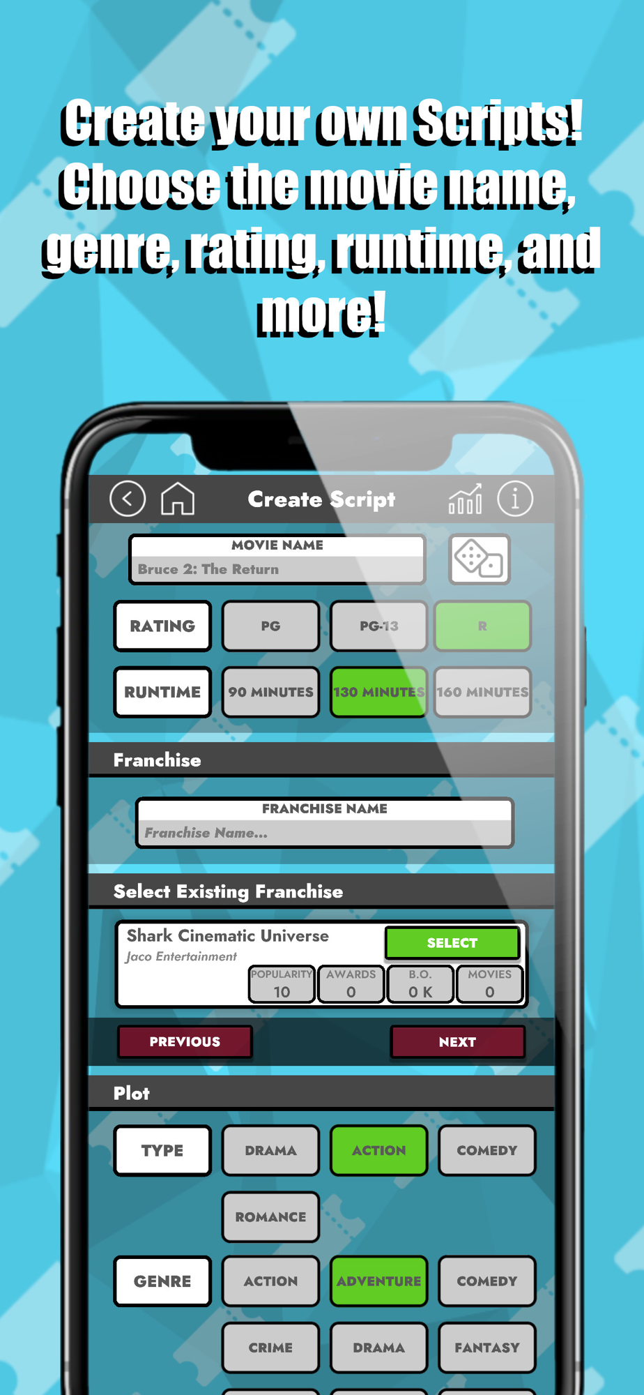 Create your own scripts, or buy existing spec scripts off the market, then cast and negotiate cast contracts. Set opportune release dates and run marketing campaigns, for the best possible opening weekend.