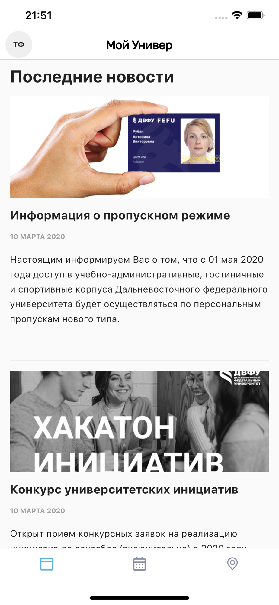 Мой Универ даёт студентам и сотрудникам доступ к полезной информации о ДВФУ, такой как последние новости из жизни университета, расписание занятий, а также карту Кампуса. Карта содержит информацию о графике работы организаций, находящихся на территории университета, а также позволяет в режиме реального времени отслеживать движение внутренних автобусов.