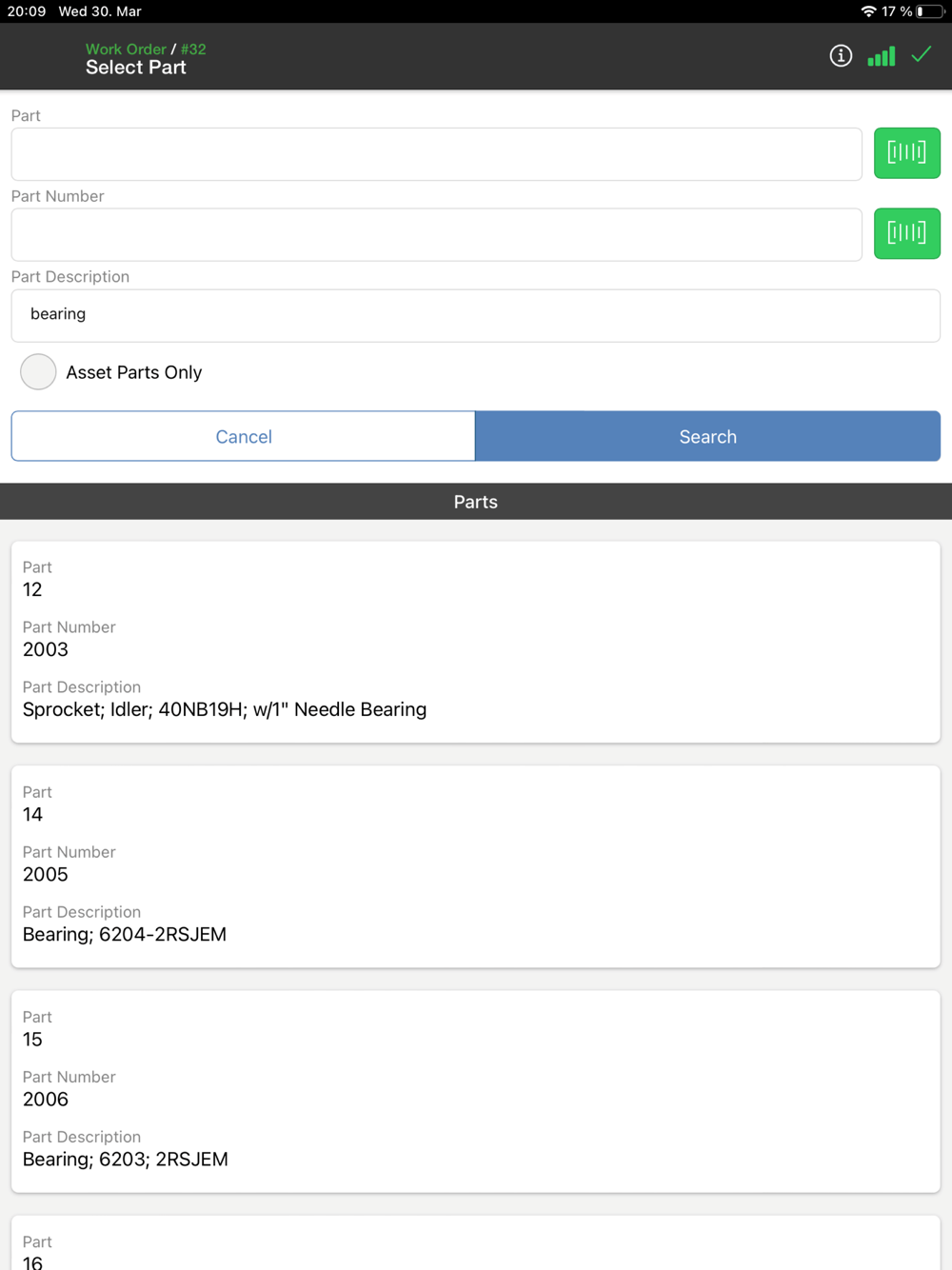 Scan QR codes and barcodes, assign assets to work orders, and browse asset documents, parts, and work order history.
