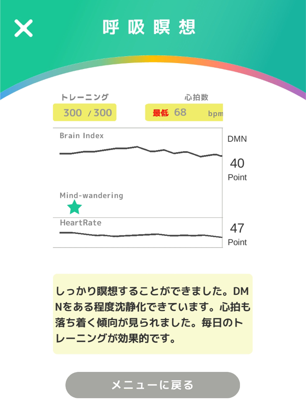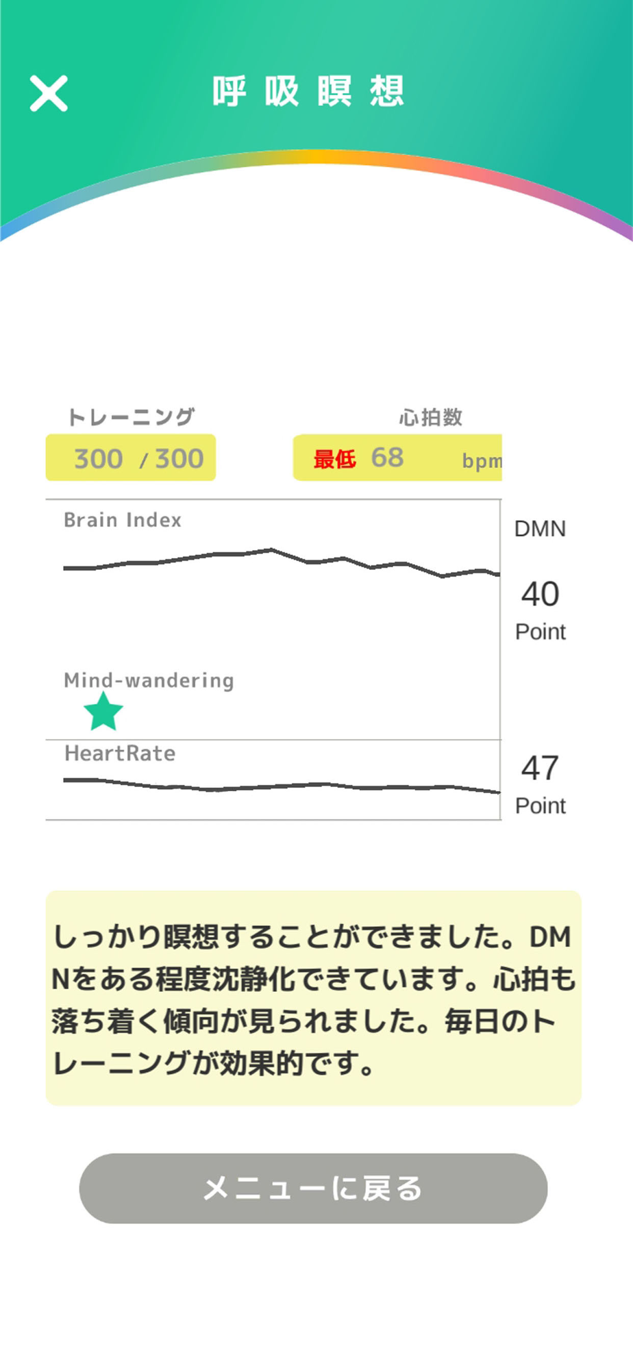呼吸瞑想は、呼吸に意識を向けることで周囲からの刺激や雑念を忘れ、脳をリラックス状態に整える効果が期待されます。脳センサーでデフォルトモード・ネットワークの活動状態をモニタリングすることで瞑想をサポートします。
