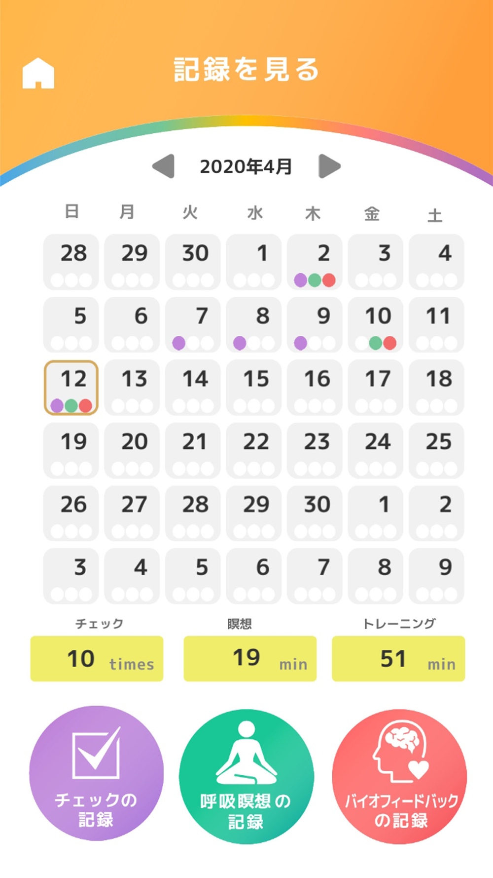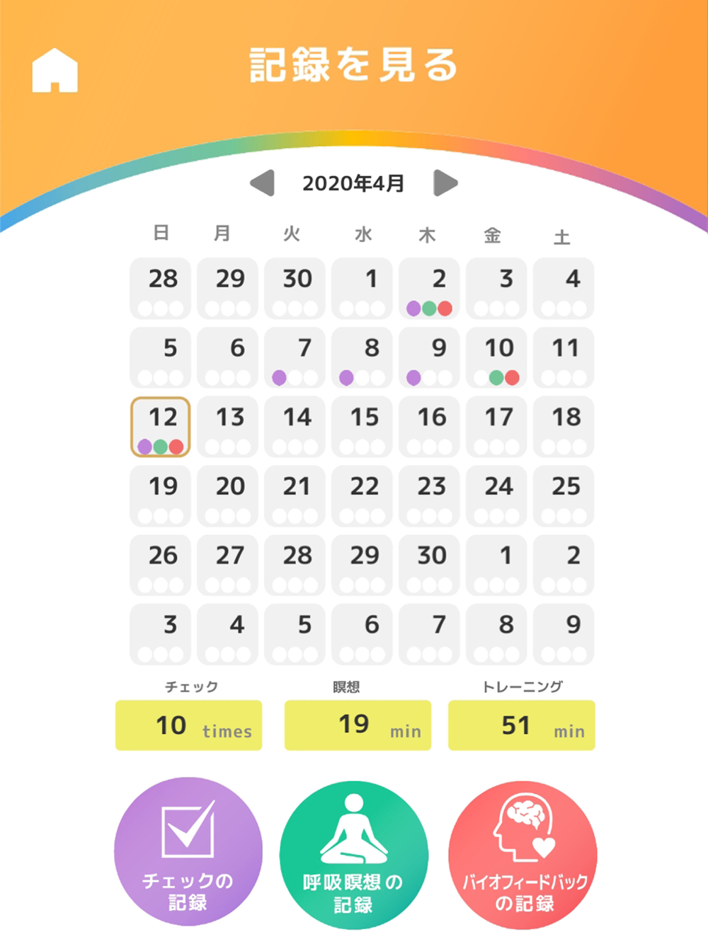 カレンダー形式で実施した日が一覧で確認でき、呼吸瞑想やバイオフィードバック・トレーニングのスコアもグラフで確認できます。