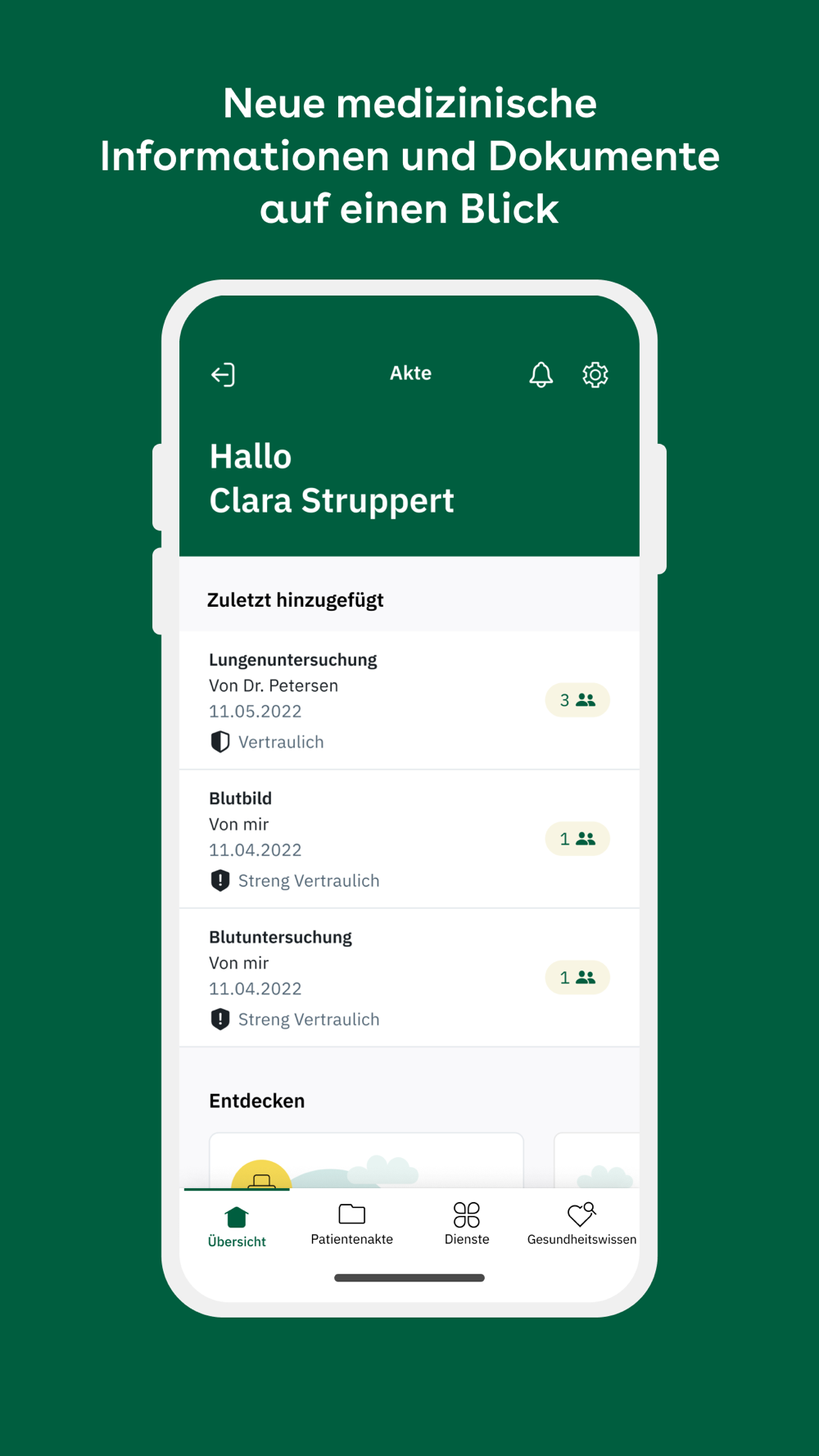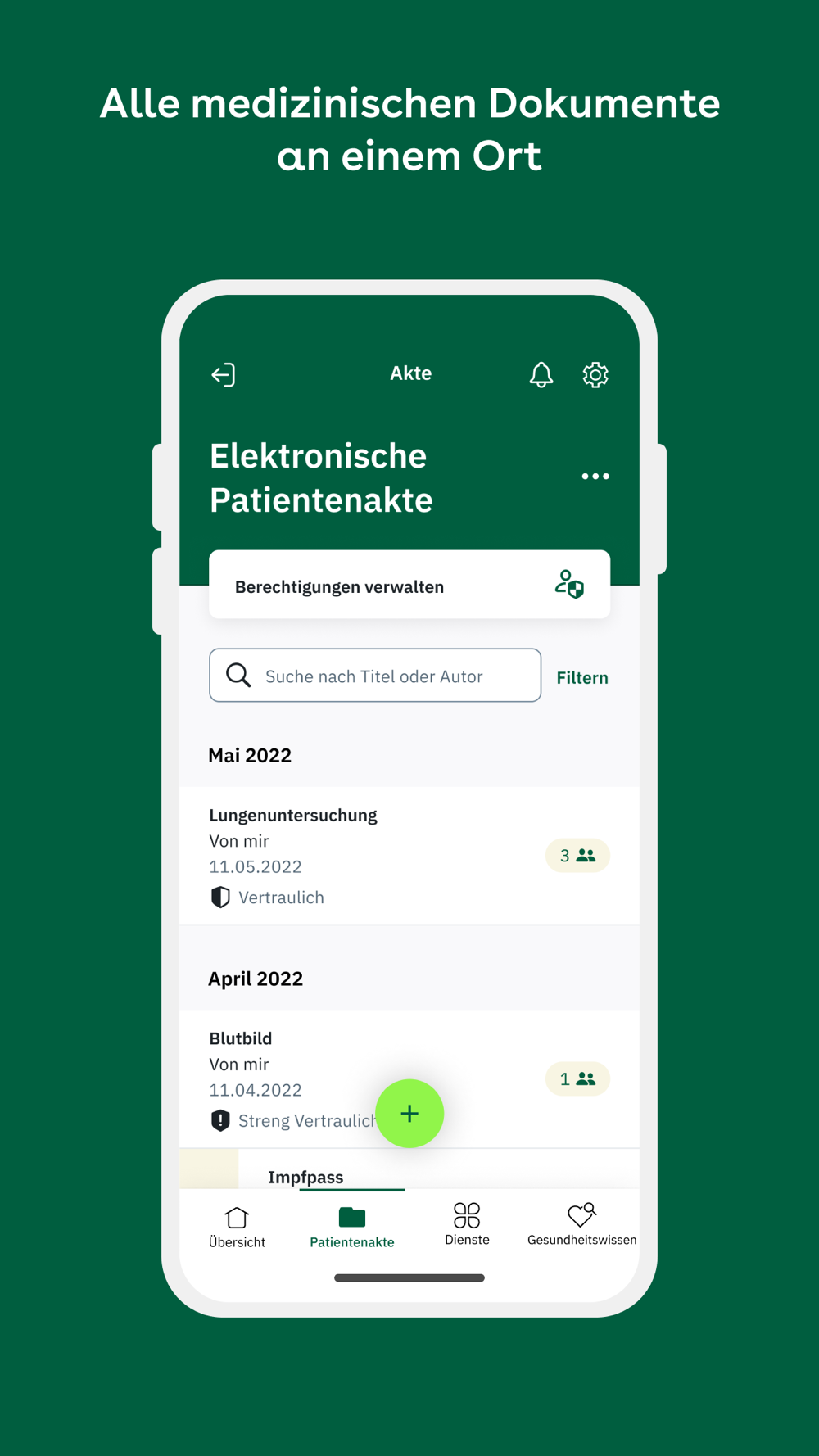 Greifen Sie auf Ihre Arztbefunde und Entlassungsberichte berechtigter Ärzte und Kliniken zu* und ergänzen Sie Ihre Gesundheitshistorie mit eigenen Dokumenten.
