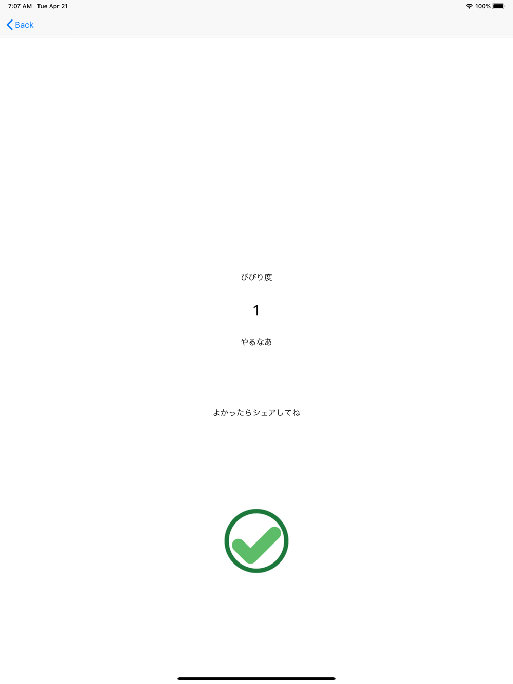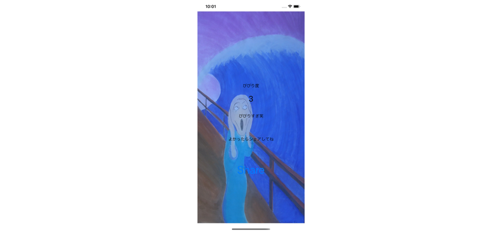 ボタンを押すと骸骨が出現して、ユーザーを驚かせます。その時のiphoneの傾き具合をセンサによって、計測してビビり度を判定します