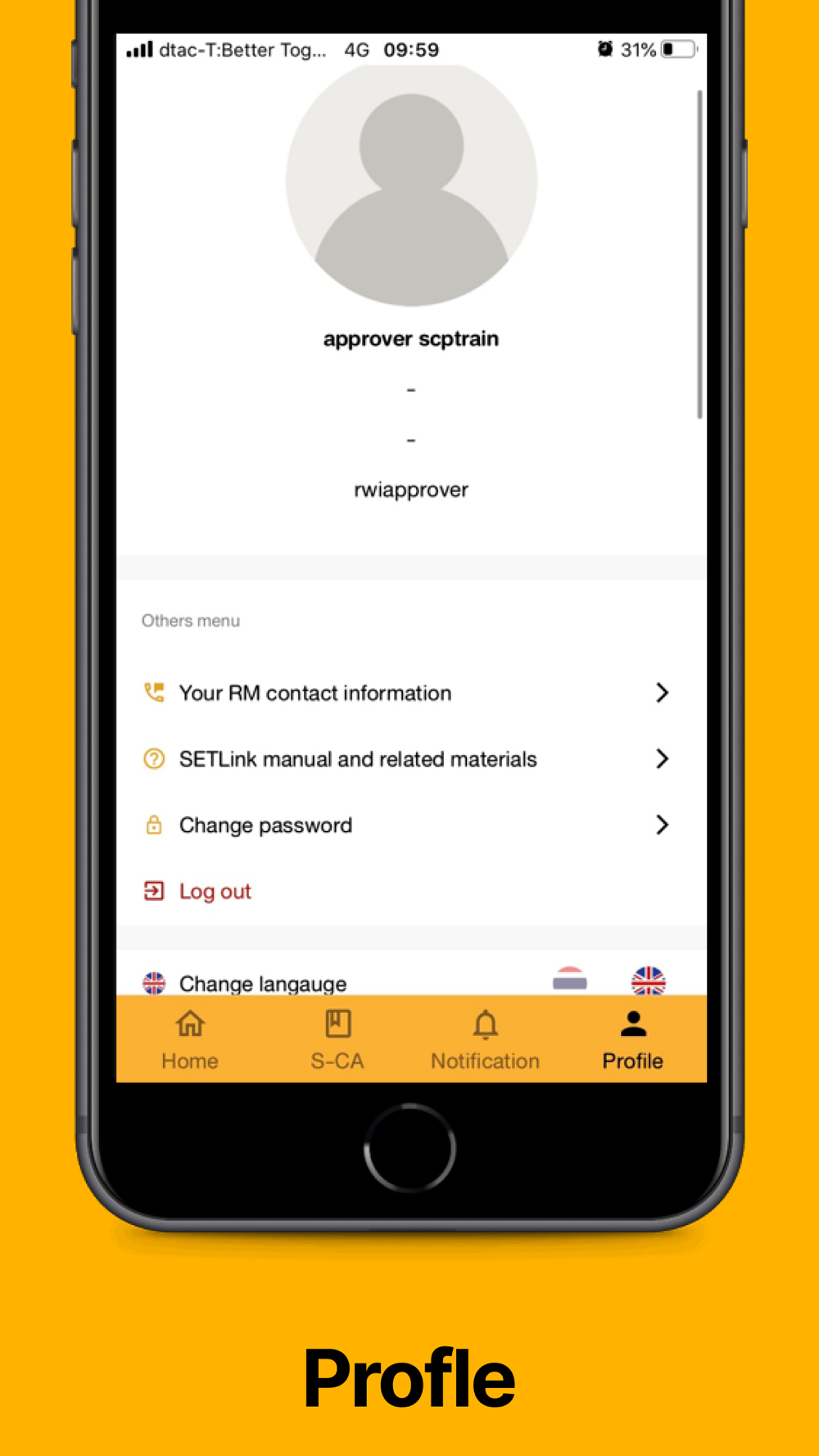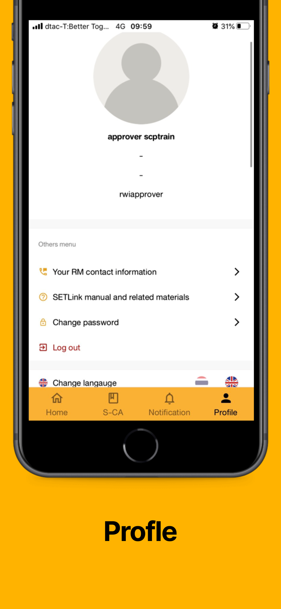 4. Profile: To view user and company profile, your company’s RM (Relationship Manager) contact information, download SETLink’ manual, change password, change application language and sing out.