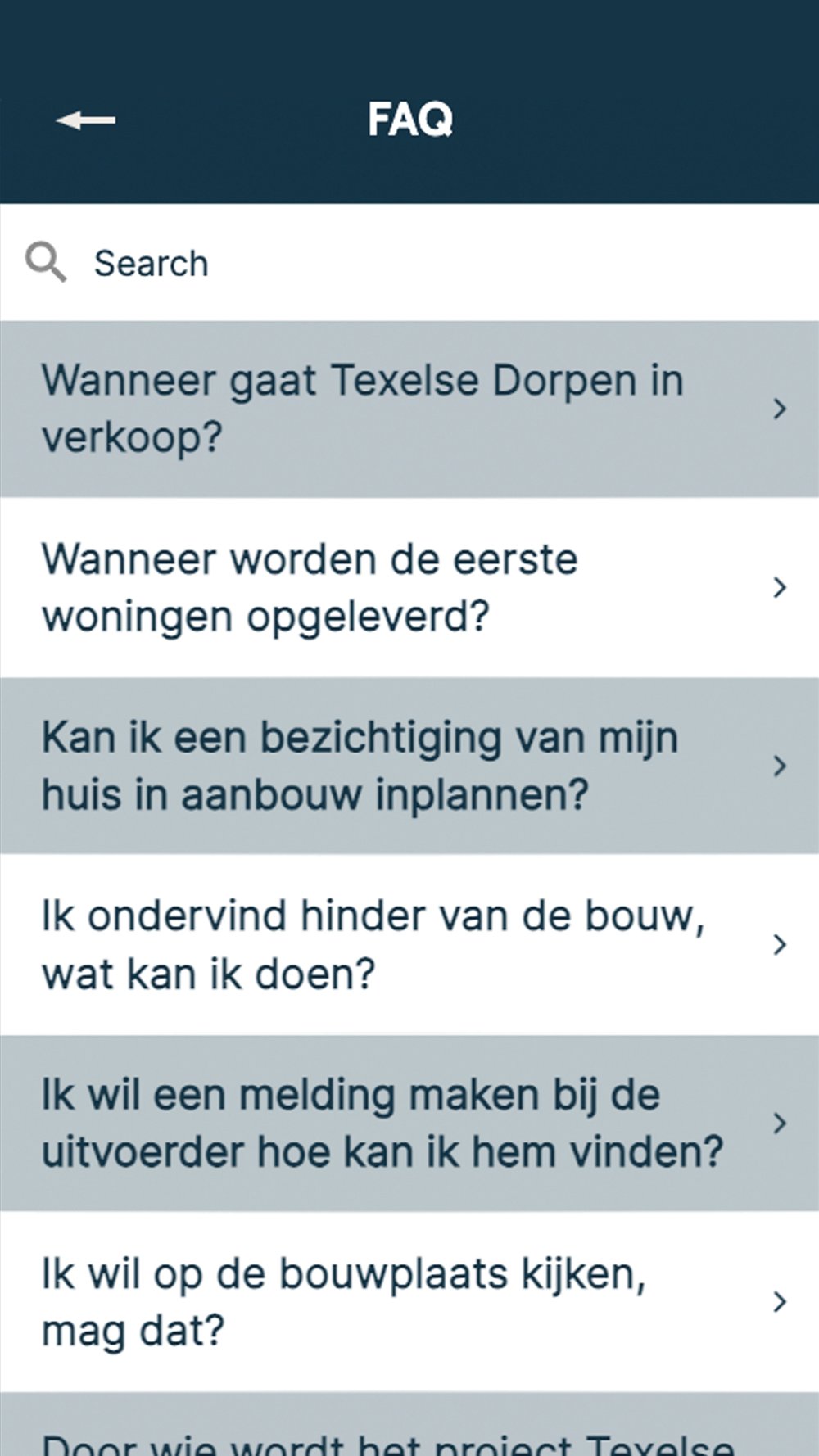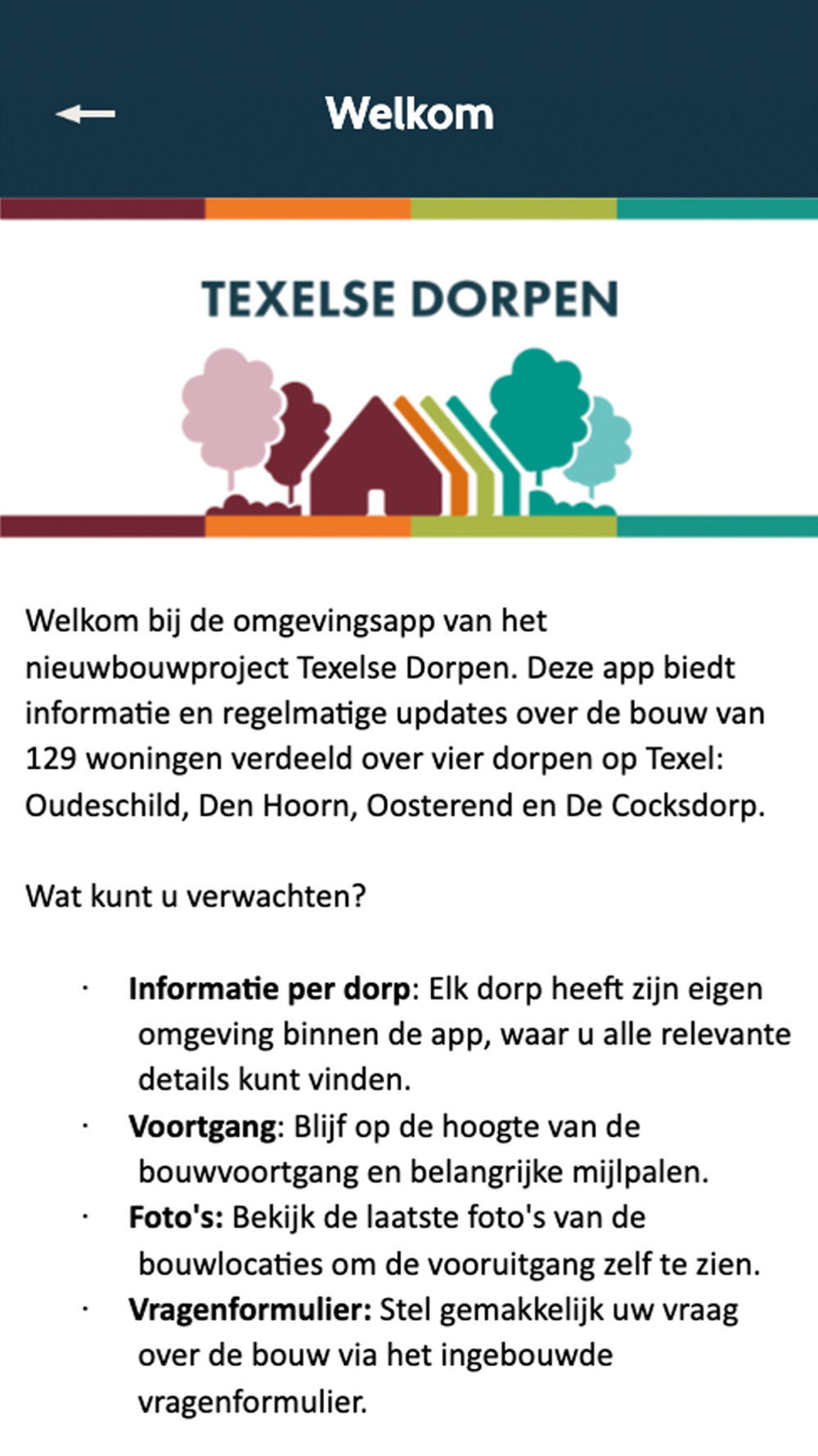 In deze app vindt u alle informatie over de werkzaamheden van het project 'Texelse Dorpen' Er wordt belangrijke projectinformatie, de planning en contactinformatie weergegeven. Ook kunt u op deze app vragen, opmerkingen of klachten achterlaten die betrekking hebben op het project.