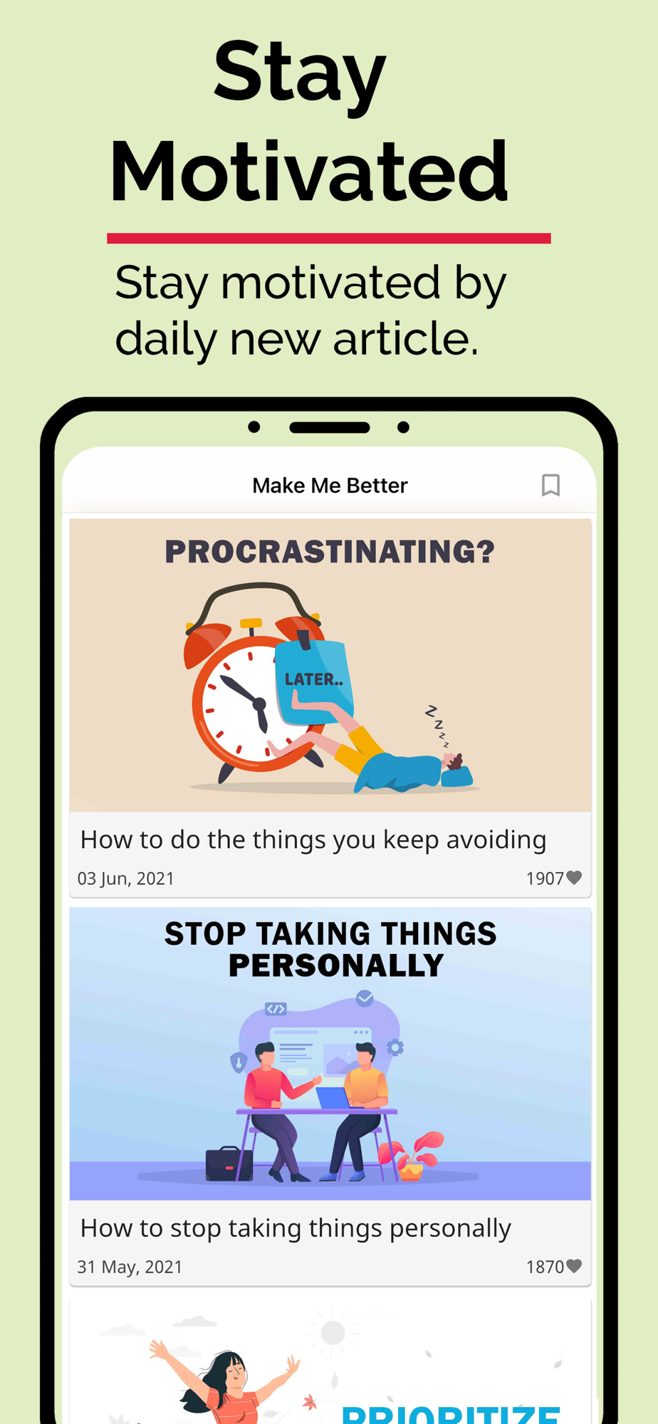 Make me better will help you to groom your personality with easy-to-follow articles. And with our intelligent recommendation system, we pick the articles that will help you improve your personality in the best way. In the app, you will get articles on different topics, like:-