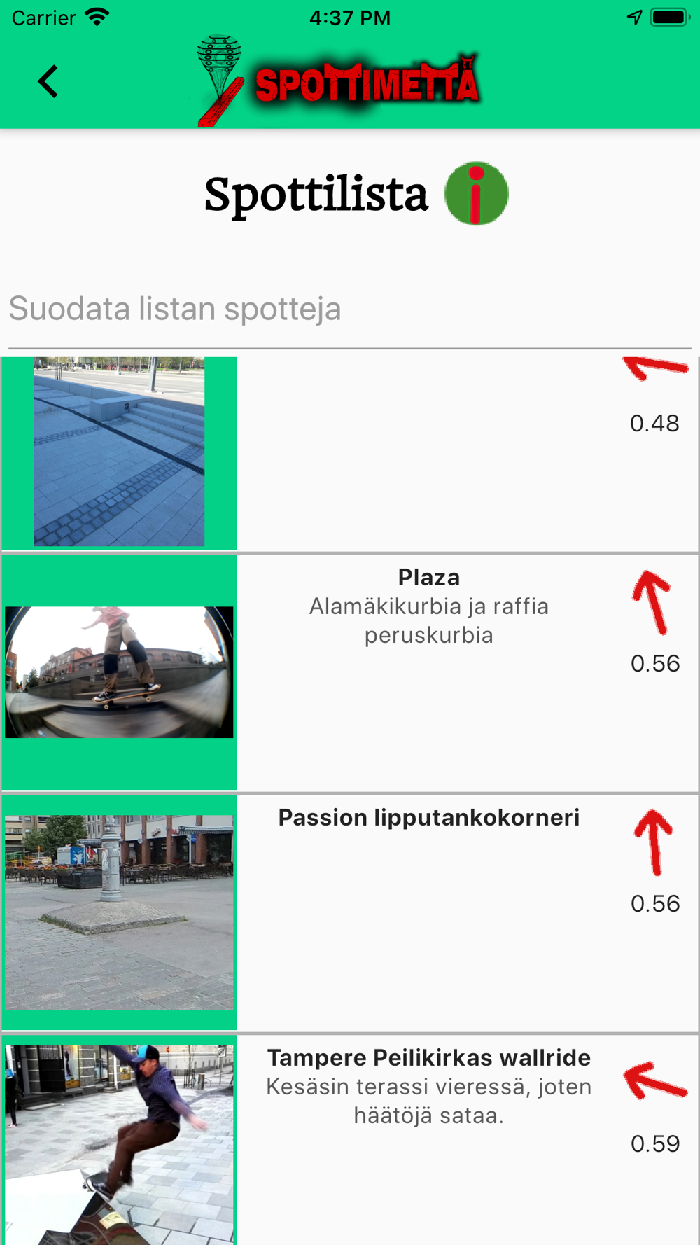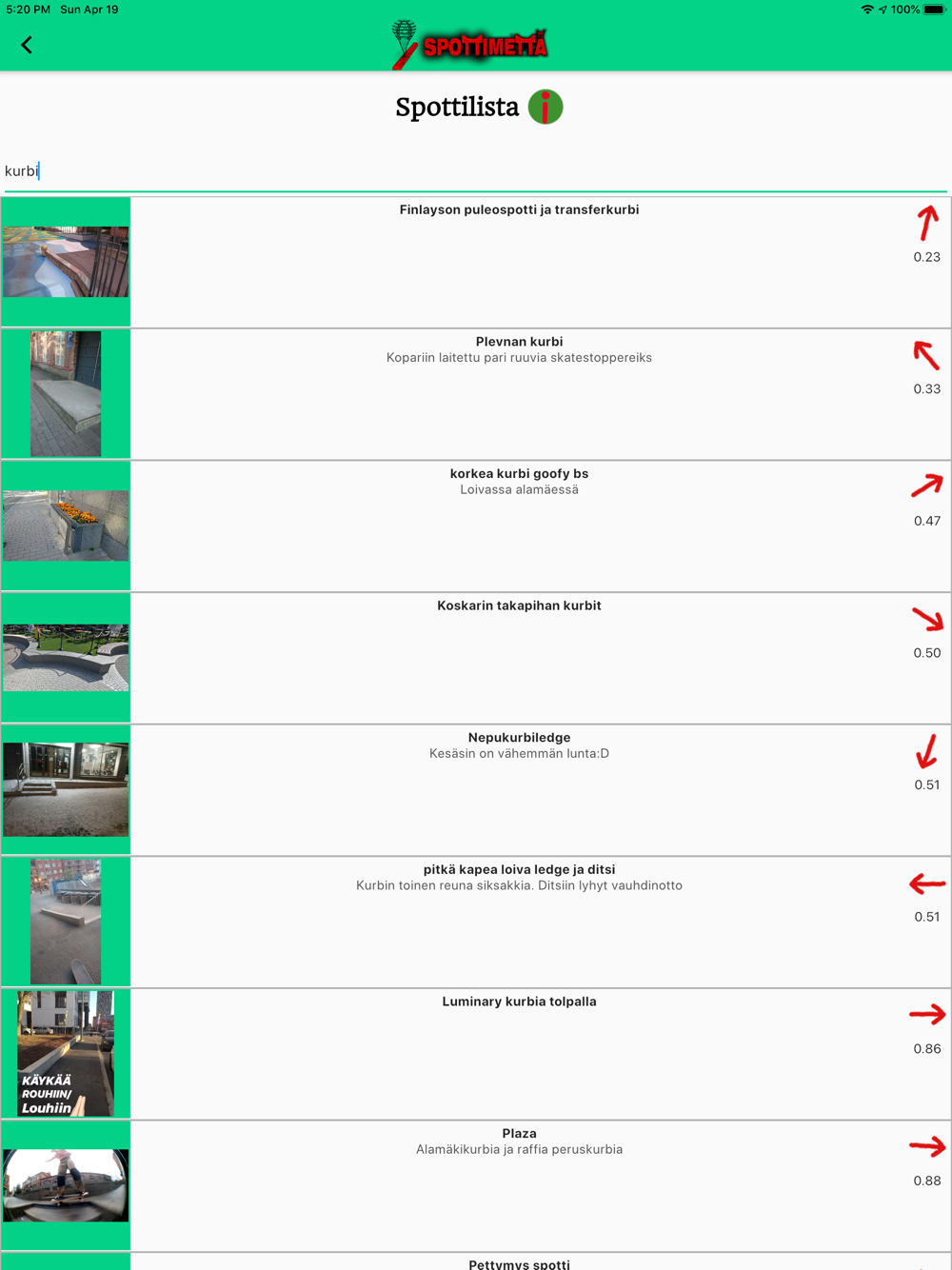Sovelluksen avulla voit lisätä spotteja, kuvia spotteihin, hakea reittiohjeet spoteille, kommentoida spotteja, sekä vaikka ja mitä. Spottien suodattaminen valmiiden kategorioiden, alueittain tai sinun päättämällä tavalla nopeuttaa juuri sinulle suotuisien spottien etsimistä. Suodatuksen lisäksi spotteja pystyy löytämään laajalti kustomoitavalla hakukentällä. Eiköhän mennä Spottimettälle! Voit käyttää myös sovellusta tietokoneella osoitteessa https://spottimetta.fi/webapp