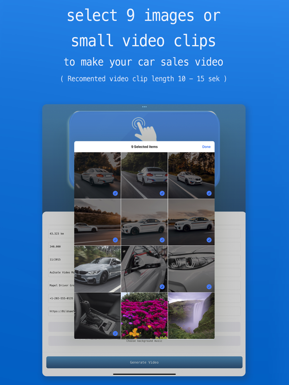 Au2sale is made so you can easily make a short sales video with specific sales information already put in the video for you so you just have to make your pictures & small video clips ready then enter your sales data in the app and then generate your video with background music and contact information all in the video.