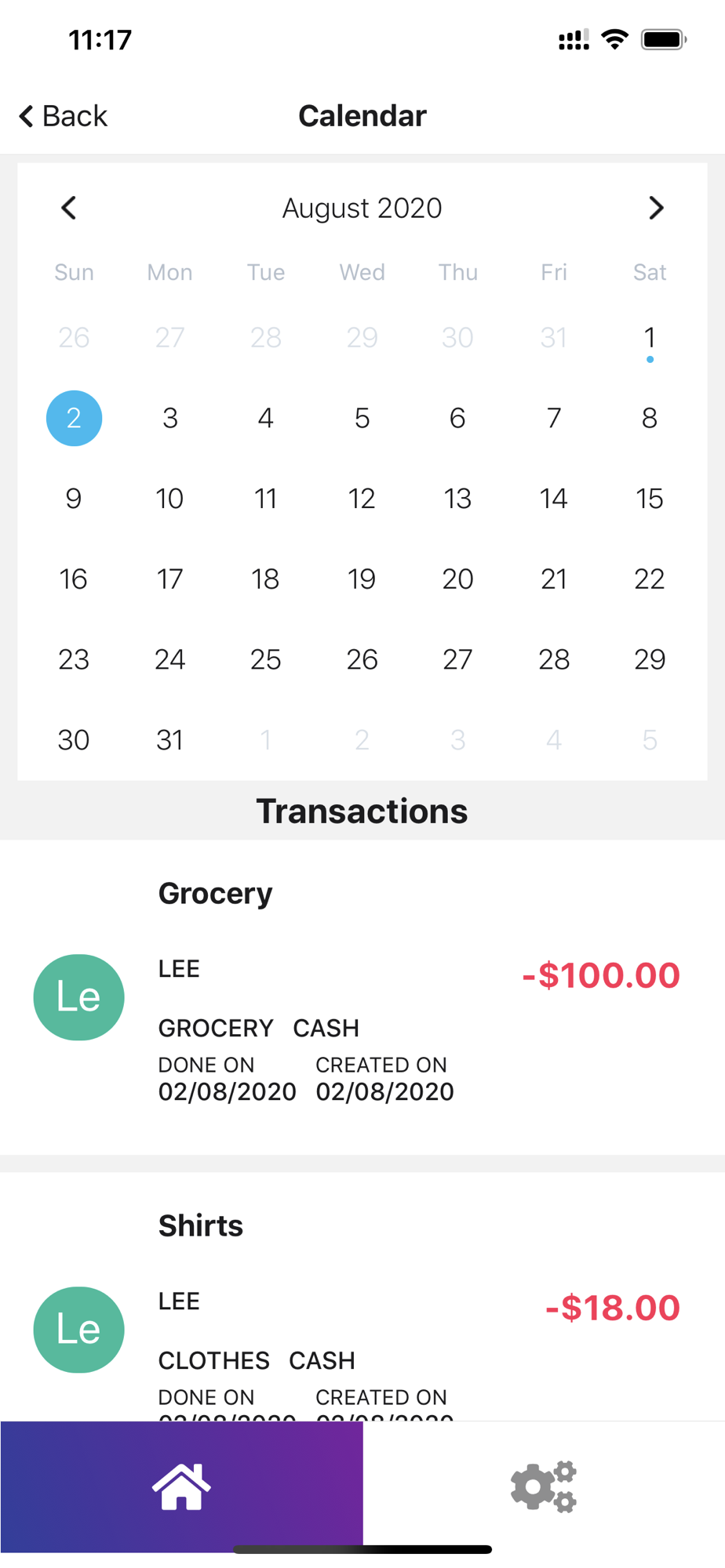 Famance calendar visualize transactions being recorded in each day that one or more records have been made for that day. Users can choose a date on the calendar and browse what transactions have been recorded for that day.
