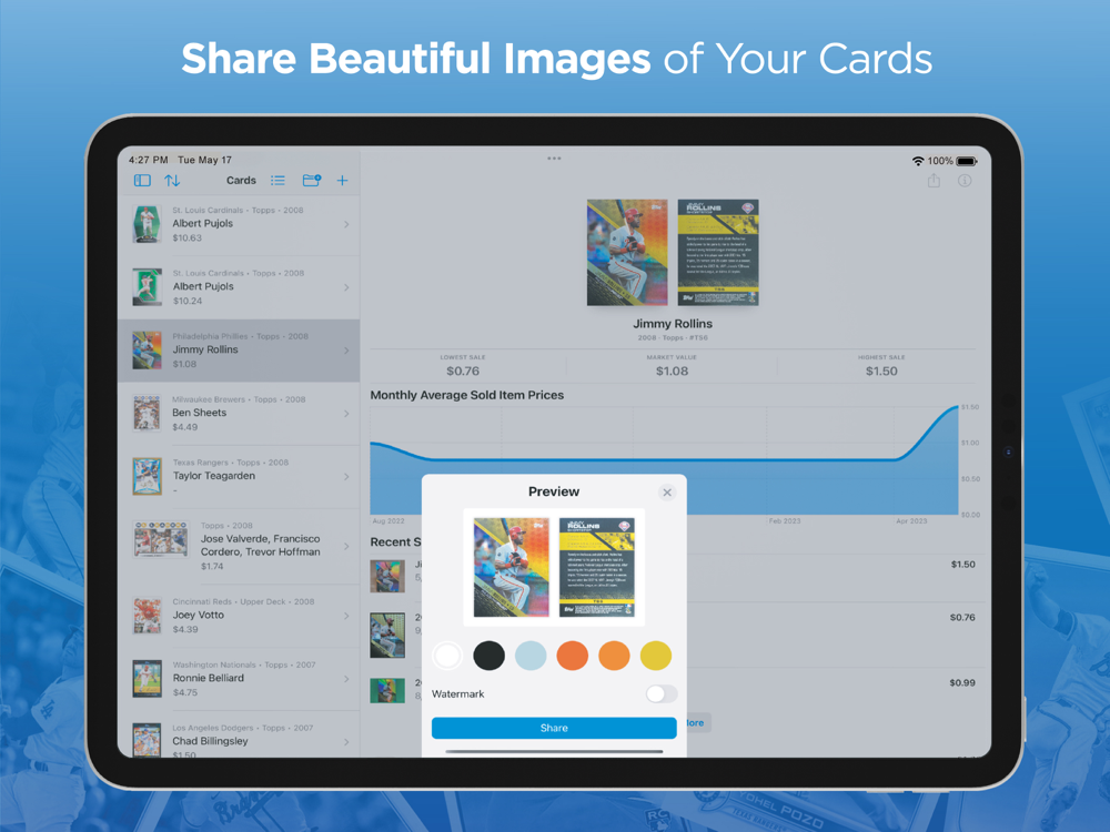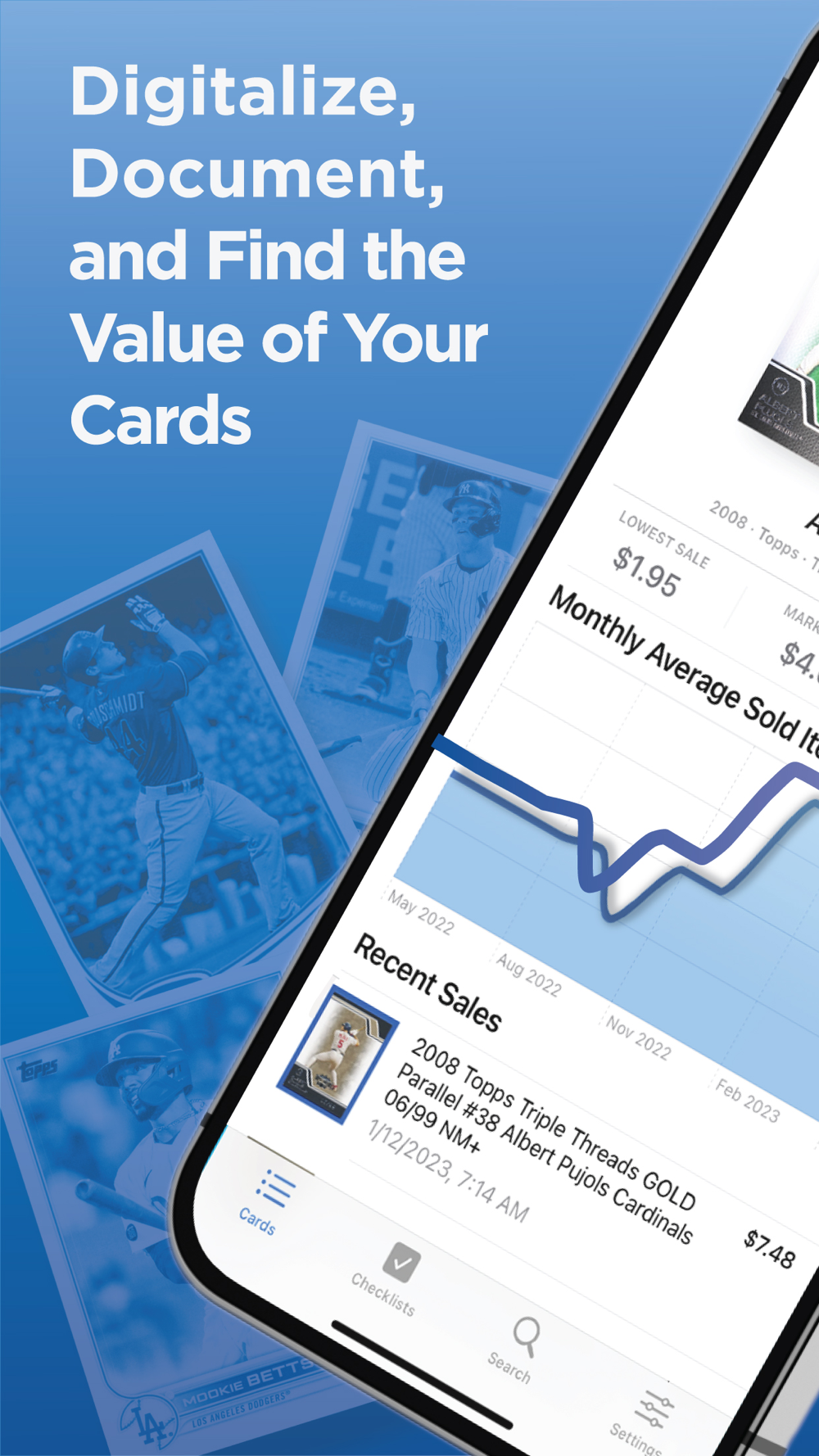 With a built-in scanner, value lookup, automatic information detection, checklist tracking, card sorting, flippable cards, beautiful image sharing, infinitely nestable folders, powerful search, iCloud sync support, CSV export, and plentiful customization options, Cardstock is the best way to digitally catalog your sports cards.