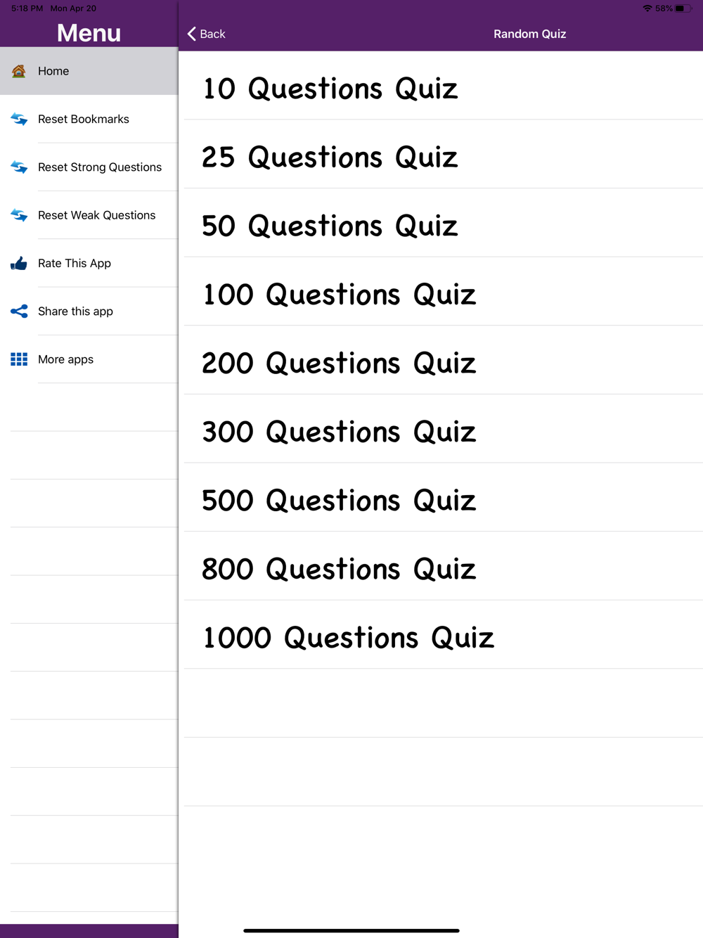 *9 Types of Mock Random Quiz Available with Different Number of Questions in Each Quiz Type.