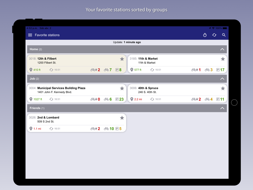 - List of favorite stations categorized by groups (home, work, friends or general).
