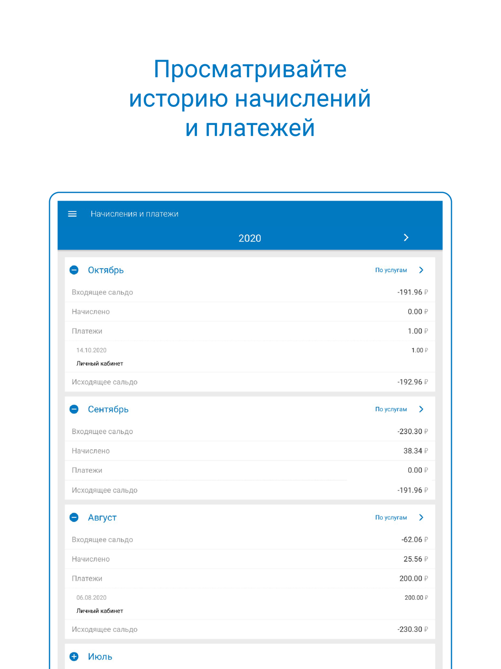 • Посмотреть историю начислений и платежей (с расшифровкой начислений по услугам за месяц)