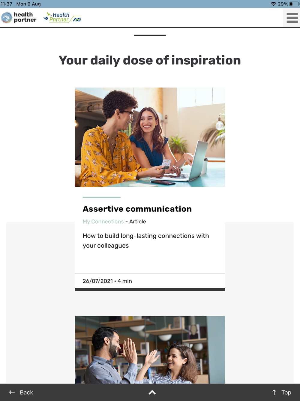 Why are you sleeping badly? What should you be eating to be more productive? How do you use constant stress to build greater resilience? With My Health Partner, you can find the answers to questions you may not yet have asked. A wide range of insights just a tap away!