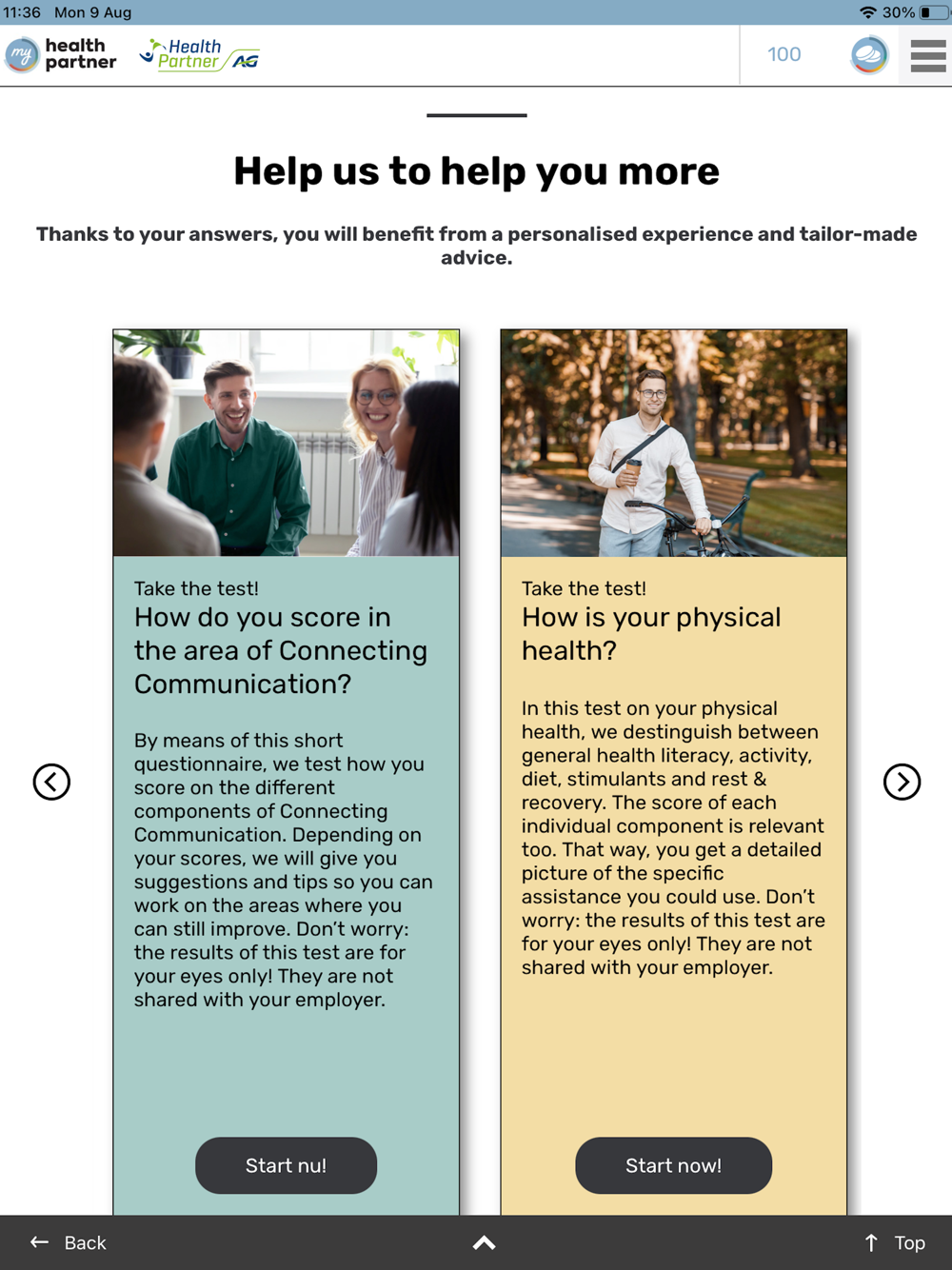 Want to make smart choices according to your lifestyle? Monitor your progress in real time? My Health Partner will support you! Fill in the scientifically based questionnaires and get the personal advice you need.