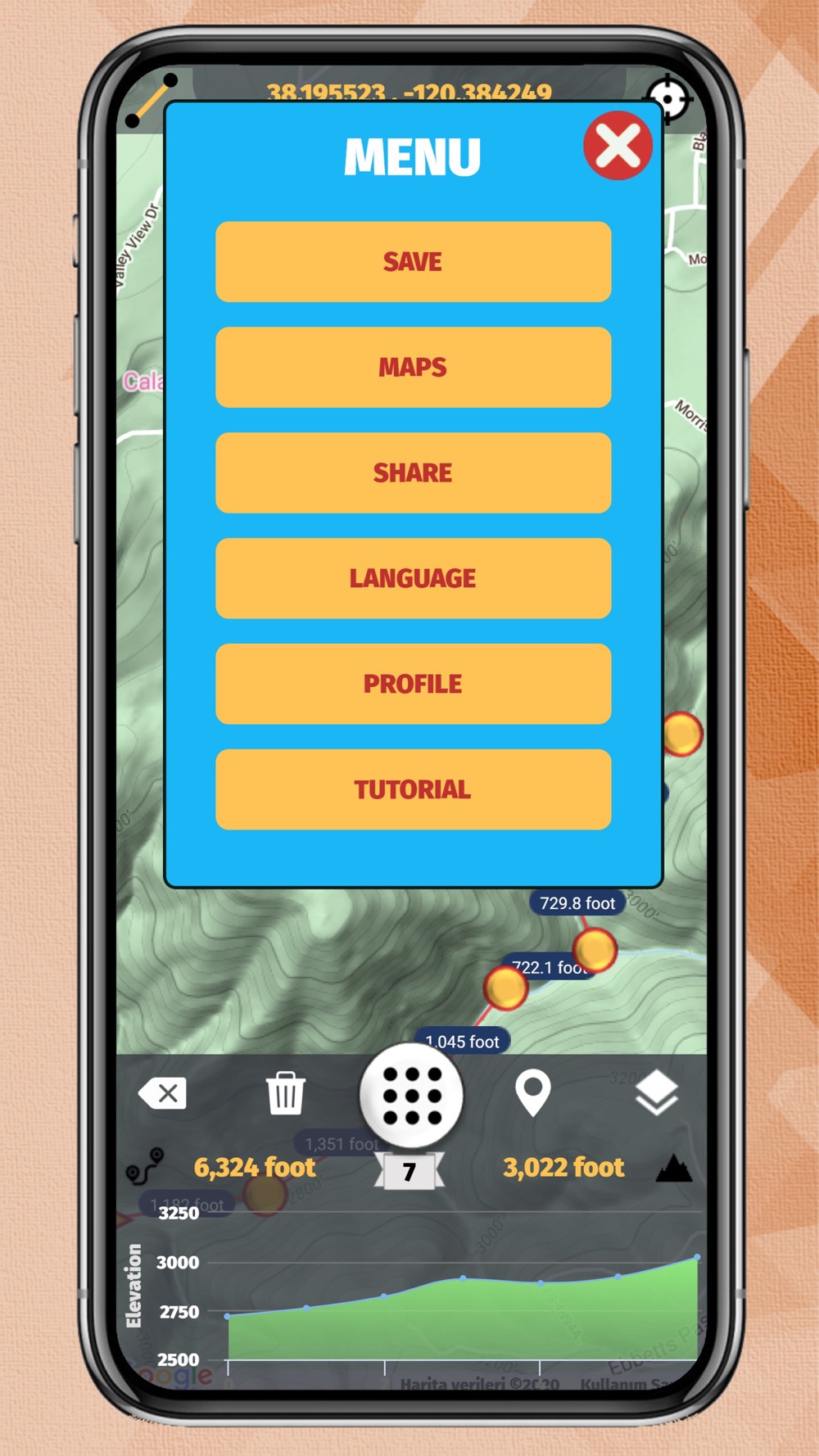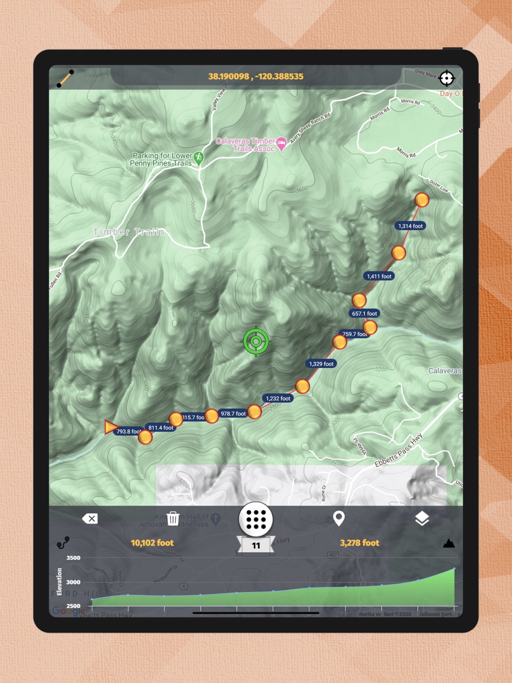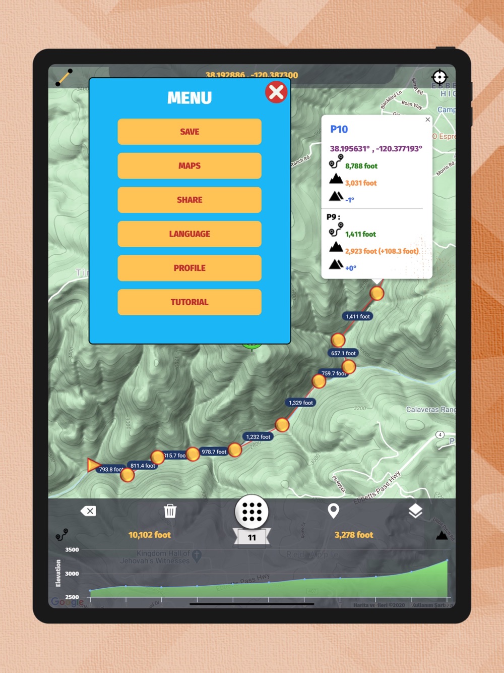 The application displays all elevation/altitude on the route determined instantly with high precision graphically. It also gives the slope, distance and height changes at each point. The distance and angle of the current point from the starting point are given.